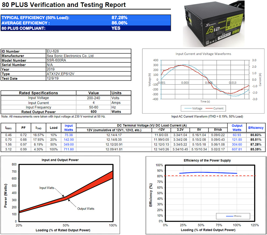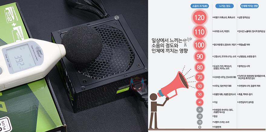 그리고, 시소닉 A12-600 파워서플라이의 전력효율 같은경우 이미 박스에서 확인했듯이 80플러스 스탠다드 등급을 받았는데, 실제 80플러스 홈페이지에 등록된 해당 모델의 테스트 결과를 보면, 평균적으로 86%수준의 전력효율을 가지고 있는 것을 확인할 수 있습니다. 특히, 230V EU 기준에서 80플러스 스탠다드를 받았기 때문에, 일반적인 115V 80플러스 기준에서 보면 80플러스 브론즈등급과 동급수준으로 브론즈 같은 스탠다드 등급이라고 생각하면 되겠습니다. 끝으로, 기본작동 시 팬 소음을 측정한 결과 약 39dB(A)로 매우 정숙한 편으로 실제 PC케이스에 장착하고 사용한다면 이보다 더 작게 들리므로 파워서플라의 팬 소음에 대해선 걱정할 필요가 없겠습니다.