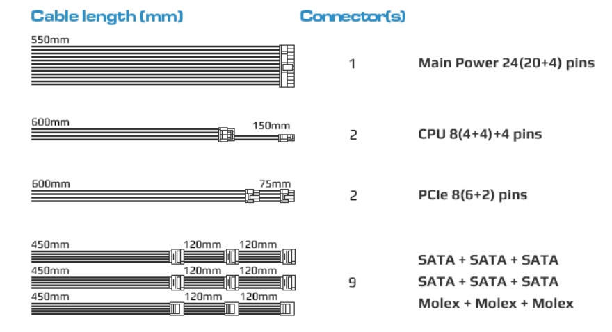 케이블 같은경우에는 메인보드 24핀 케이블을 제외한 나머지 케이블들이 플랫(Flat)타입인데, 조금 아쉬운 점은 케이블 출력구의 별도의 마감처리가 없습니다. 크게 신경 쓸 부분은 아니지만, 그래도 보급형 제품에서도 마감처리가 된 경우가 많기 때문에, 먼지 유입에 민감한 소비자라면 아쉬울 수도 있는 부분이라 생각됩니다. 전선 규격은 18AWG로 인텔 파워서플라이 가이드 표준에 맞게 사용되었고, 케이블 길이도 요즘 PC케이스에 맞춰서 나왔기 때문에 부족하지 않는 길이입니다.