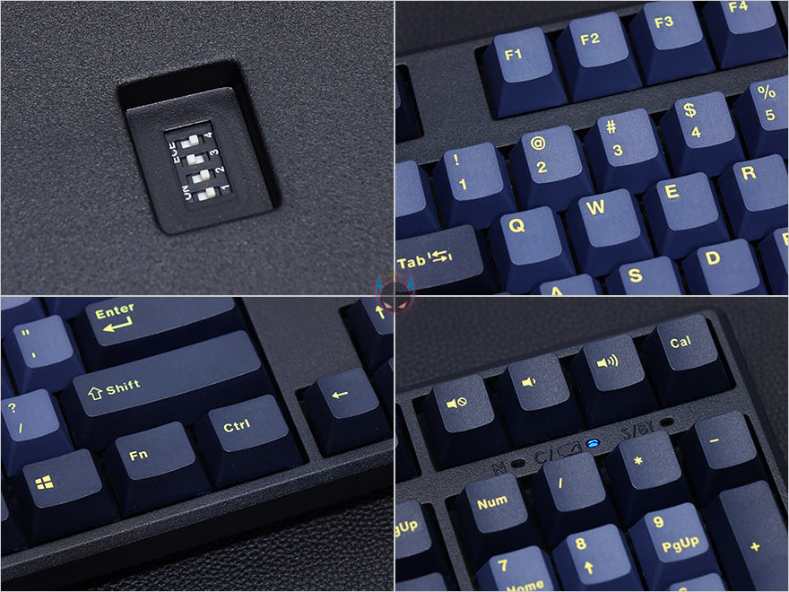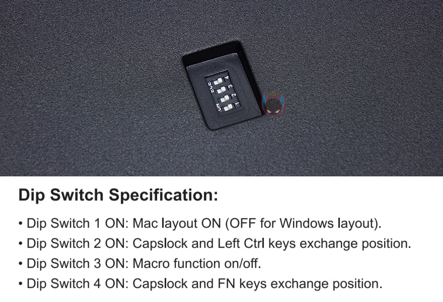 마지막으로 매크로 기능은 DIP 스위치에서 3번 스위치를 On으로 선택한 후 Fn+1/2/3/4 숫자 키 중 1번은 기본 레이아웃이기 때문에 제외되고 나머지 2,3,4번 중에 레이아웃 하나를 선택합니다. 그리고나서, Fn+오른쪽 Ctrl 키를 누르면 LED 인디케이터의 가운데 Capslock LED부분이 깜빡이는데, 이때 매크로를 실행할 키를 선택하고, 그 다음부터 매크로값을 입력합니다. 입력이 끝난 후에는 오른쪽 Alt키를 한 번 누르면 입력값이 저장되고, 마지막으로 Fn+오른쪽 Ctrl키를 다시 누르면 매크로 입력모드가 종료되고, 선택한 매크로 실행 키를 누르면 매크로값이 실행되는 것을 확인할 수 있을겁니다.