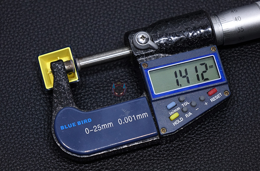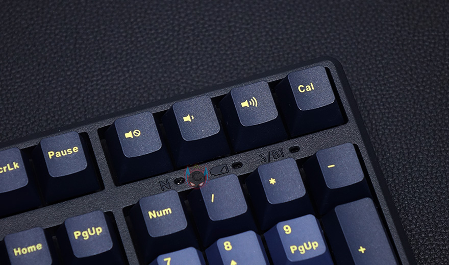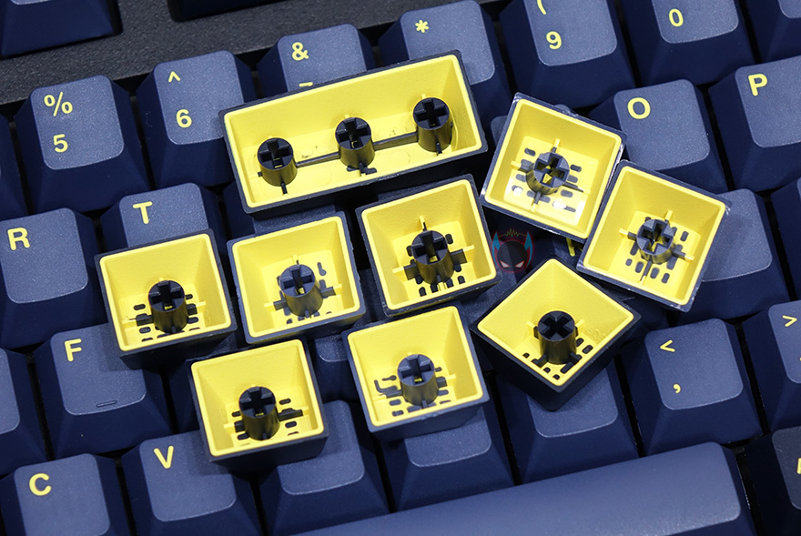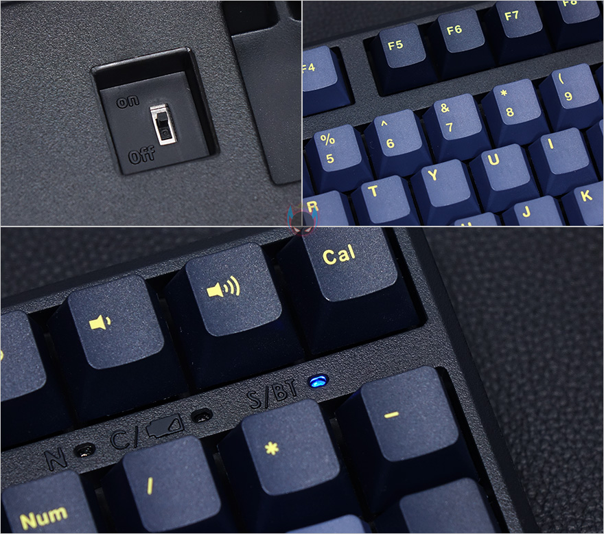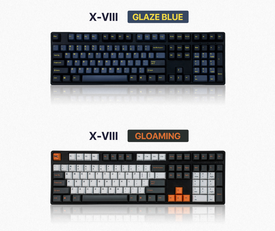 위에서 잠깐 언급했듯이 스위치와 블루투스 유무 외에 색상으로도 제품이 나뉜다고 했는데, 바로 키-캡의 색상입니다. 블루색상 계열의 투톤 키-캡으로 적용된 모델은 글레이즈 블루(Glaze Blue), 화이트&그레이 투톤 키-캡의 모델은 글루밍(Gloaming)으로 명하고 있죠. 당연히 키-캡은 이미 제품박스에서 확인했듯이 PBT재질의 이중사출 방식으로 처리되었는데, 요즘 PBT 이중사출 키-캡 단가를 줄이기 위해서 이중 비율을 줄이는 경우가 많아졌는데, 이 X-VIII 키보드는 예전처럼 100% 비율의 완전 이중 사출 방식입니다. 그래서, 키-캡 두께도 약 1.4mm로 두꺼운 편이죠.