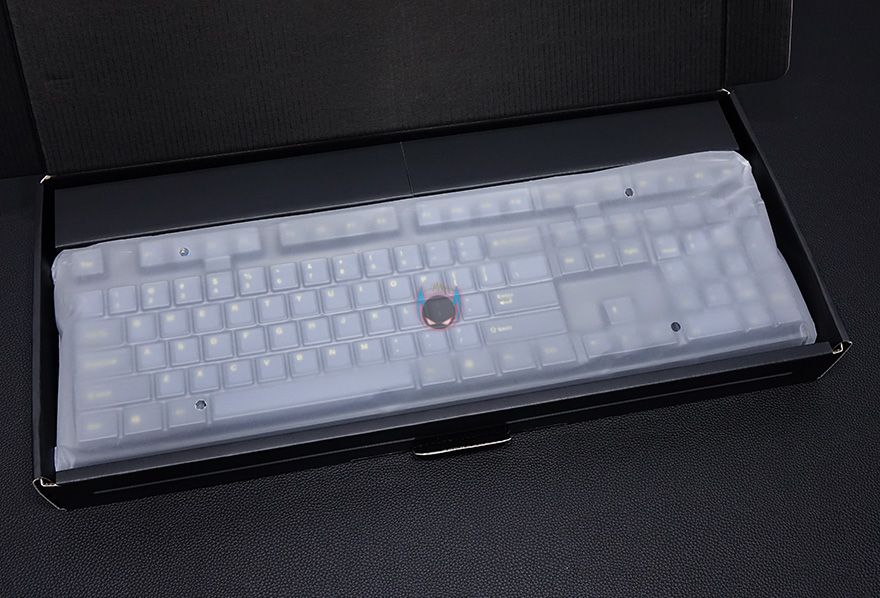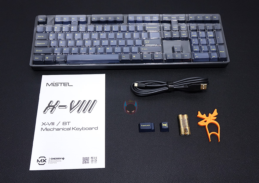박스를 열어보면, 키보드는 기본적으로 비닐포장된 것을 확인할 수 있고, 얇은 투명 루프도 제공을 해줍니다. 제품구성은 X-VIII 키보드, 제품설명서, 분리형 USB 전원케이블, 교체용 추가 키-캡, AAA 건전지(2개), 키-풀러로 이루어져 있죠.