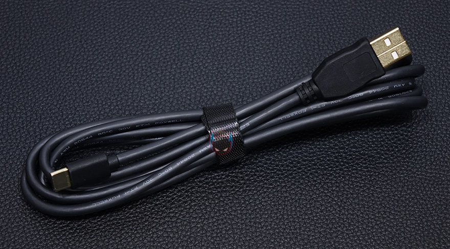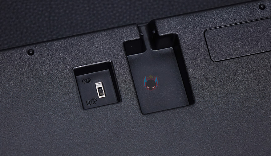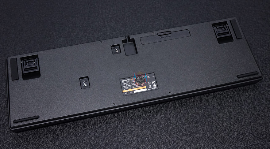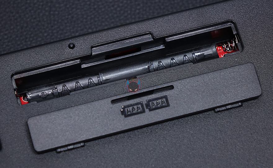 X-VIII 키보드 밑바닥부분에는 미끄럼방지 고무패드 기본 부착과 함께 가운데 부분에는 유선 사용시 분리형 USB 전원케이블과 연결되는 포트배치와 바로 왼쪽에 무선 On/Off 스위치가 배치되어 있으며, 오른쪽에는 무선 사용시 필요한 AAA건전지 수납함이 배치되어 있는데, 구성품에서 이미 확인했듯이 건전지는 2개가 사용됩니다. 그리고, 중간 왼쪽 아랫쯤에 DIP 스위치가 적용되어 있는데, 스위치 설정에 따라 맥/윈도우 운영체제 자판 레이아웃, Capslock과 왼쪽 컨트롤 키 기능 서로 바꾸기, 매크로 기능 On/Off, Capslock과 Fn키 기능 서로 바꾸기를 설정할 수 있습니다. 이외에 밑바닥 양쪽 앞부분에 2단 높낮이 조절 받침대가 적용되어 있고, 유선시 사용되는 분리형 USB 전원케이블은 Type-C to Type-A 인터페이스로 양쪽 모두 금도금처리가 되어있고, 케이블 길이는 1.8m 입니다.