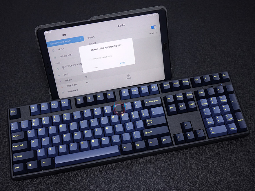 실제로 X-VIII 키보드를 사용해보면, 유선을 그냥 분리형 USB 전원케이블을 연결해서 사용하면 되고, 블루투스 방식의 무선 사용은 건전지를 넣고, 무선 스위치를 On으로 선택한 후 Fn+6/7/8 숫자키 중 하나를 선택해서 3초이상 누르고 있으면 숫자키패드위에 배치된 LED 인디케이터에서 BT부분이 깜빡이게 됩니다. 그럼, 이때가 페어링 모드가 시작되는 것이고, 연결한 기기에서 Mistel이라는 신호가 잡히면 연결을 해주면 됩니다. 연결된 후에는 실행 프로그램에 따라 Fn키 조합의 부가기능들도 함께 사용하면 됩니다.