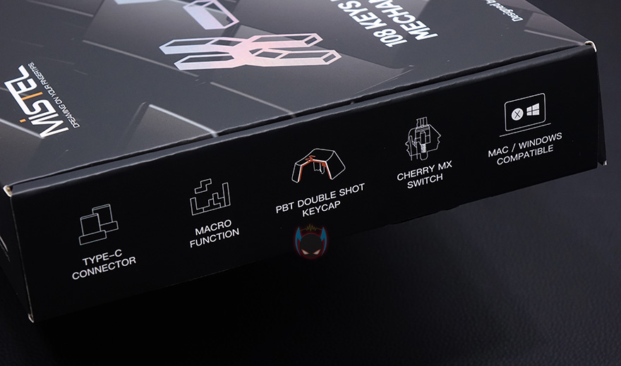 제품박스에는 제품 이미지를 담고 있지 않기때문에 미리 확인할 수 없지만, 모델명과 함께 108키라는 문구를 확인할 수 있어서, 일반 104키 풀-배열에 추가적인 키가 더 있다라는 것을 짐작할 수 있습니다. 박스 한쪽 측면에는 유선 연결방식, 매크로, PBT 이중사출 키-캡, 체리MX 스위치, 맥 OS/윈도우 운영체제 호환지원 표기를 확인할 수 있고, 반대쪽 측면에는 제품 구분 표기를 확인할 수 있는데, 체리MX 스위치 총 7가지와 블루투스 유무에 따라 나뉜다라는 것을 알 수 있습니다. 색상에 따라서도 나뉘는데 그부분은 뒤에서 확인할 수 있습니다. 그리고, 박스 뒷면에는 간략하게 제품의 크기와 무게 정도를 확인할 수 있죠.