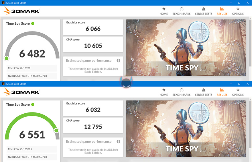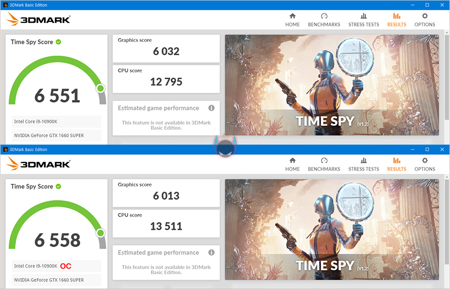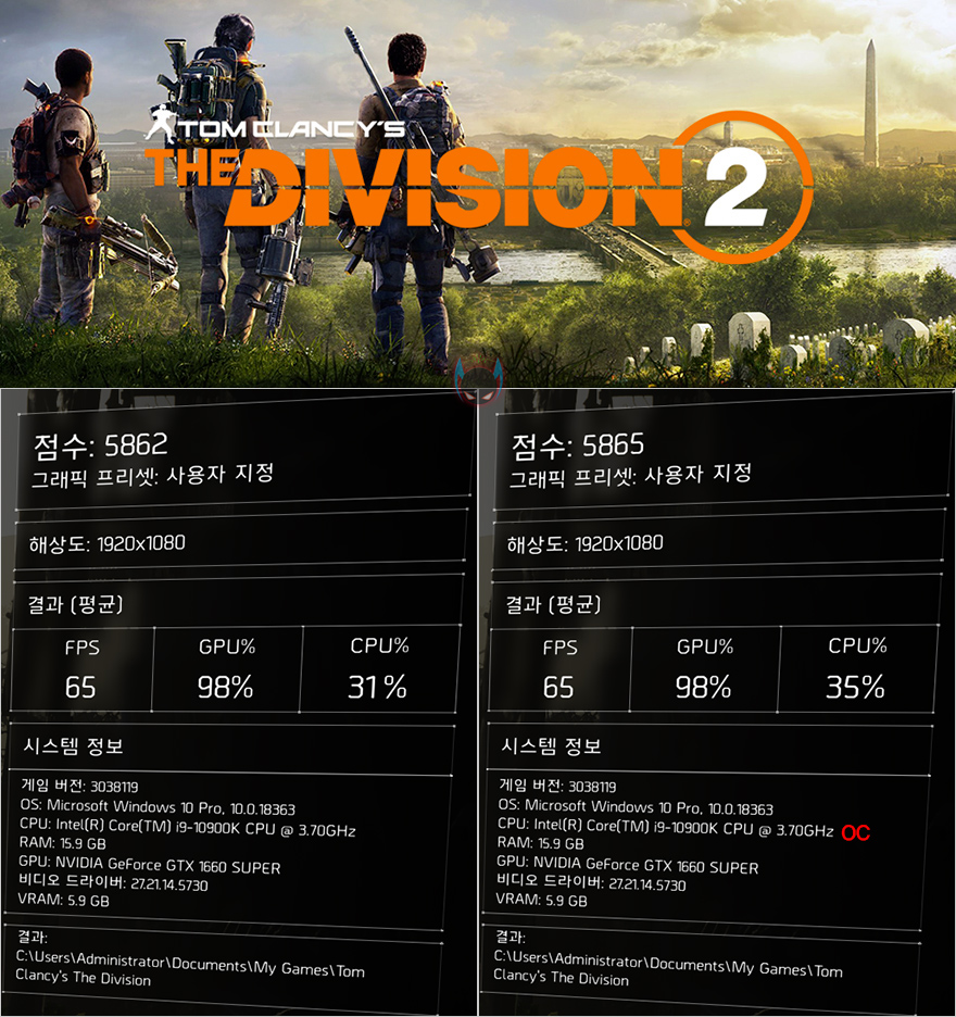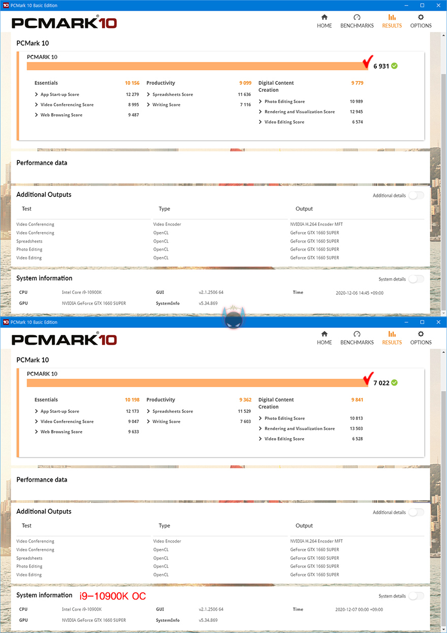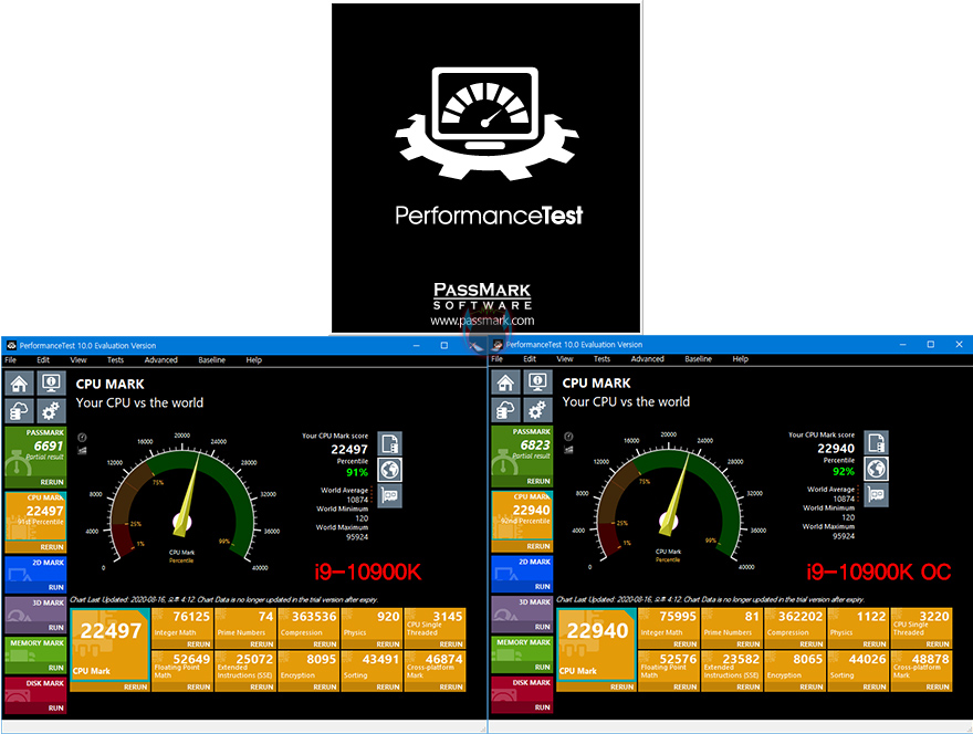 이렇게 i9-10900K CPU와 메모리 모두 오버클럭을 한 상태에서 앞에서 진행했던 벤치마크 8종을 다시 모두 실행해보면, 기본설정으로 사용했을 때보다 확실히 오버클럭 했을 때 성능이 전반적으로 더 올라가는 것을 확인할 수 있죠. 물론, 오버클럭 시 기본설정 사용때보다 발열이 더 높게 발생하기 때문에, 다시한번 강조하지만, 충분한 쿨링 시스템 환경은 갖추고 있어야 하겠습니다.