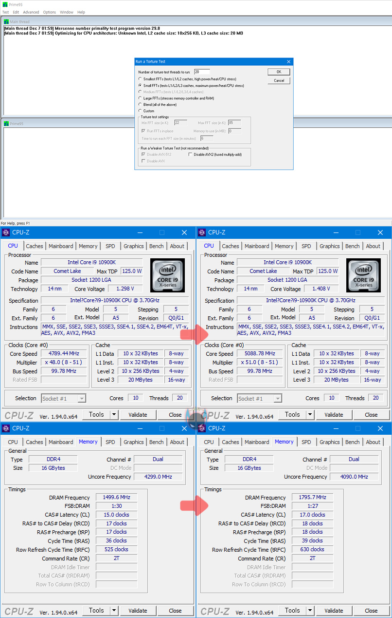 끝으로, i9-10900K는 앞에서 언급했듯이 오버클럭을 지원하는 K-CPU죠. 그래서, 오버클럭을 안해볼 수 없는데, 앞에서 기본설정으로 사용할 때는 최대 4.8GHz까지 작동된다고 했는데, 이는 과부하가 걸릴 시 All-코어 최대 클럭입니다. 그럼, 오버클럭은 이보다 좀 더 높게 할 수 있겠죠. 실제로 Prime95 프로그램을 통해 최종적으로 오버클럭한 결과값은 5.1GHz 수준입니다. 물론, 메인보드 모델에 따라서 오버클럭 수치는 차이가 있을 수 있습니다. 그리고, 메모리 클럭도 3000MHz에서 3600MHz으로 오버클럭을 적용했습니다. 참고로, i9-10900K 같은경우 최상위 CPU이고, 많은 코어와 쓰레드를 가진 CPU인만큼 오버클럭시에는 발열해결을 위해서 고급형 공랭쿨러나 수냉 쿨러 환겨을 갖추는 것을 권합니다.