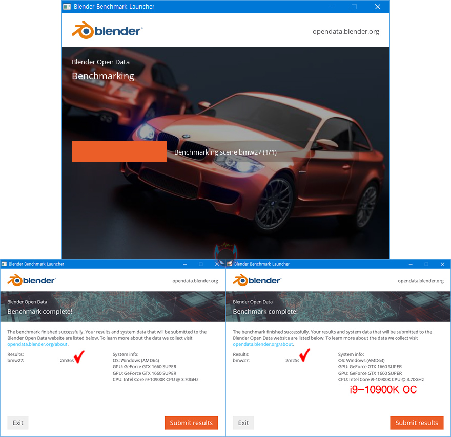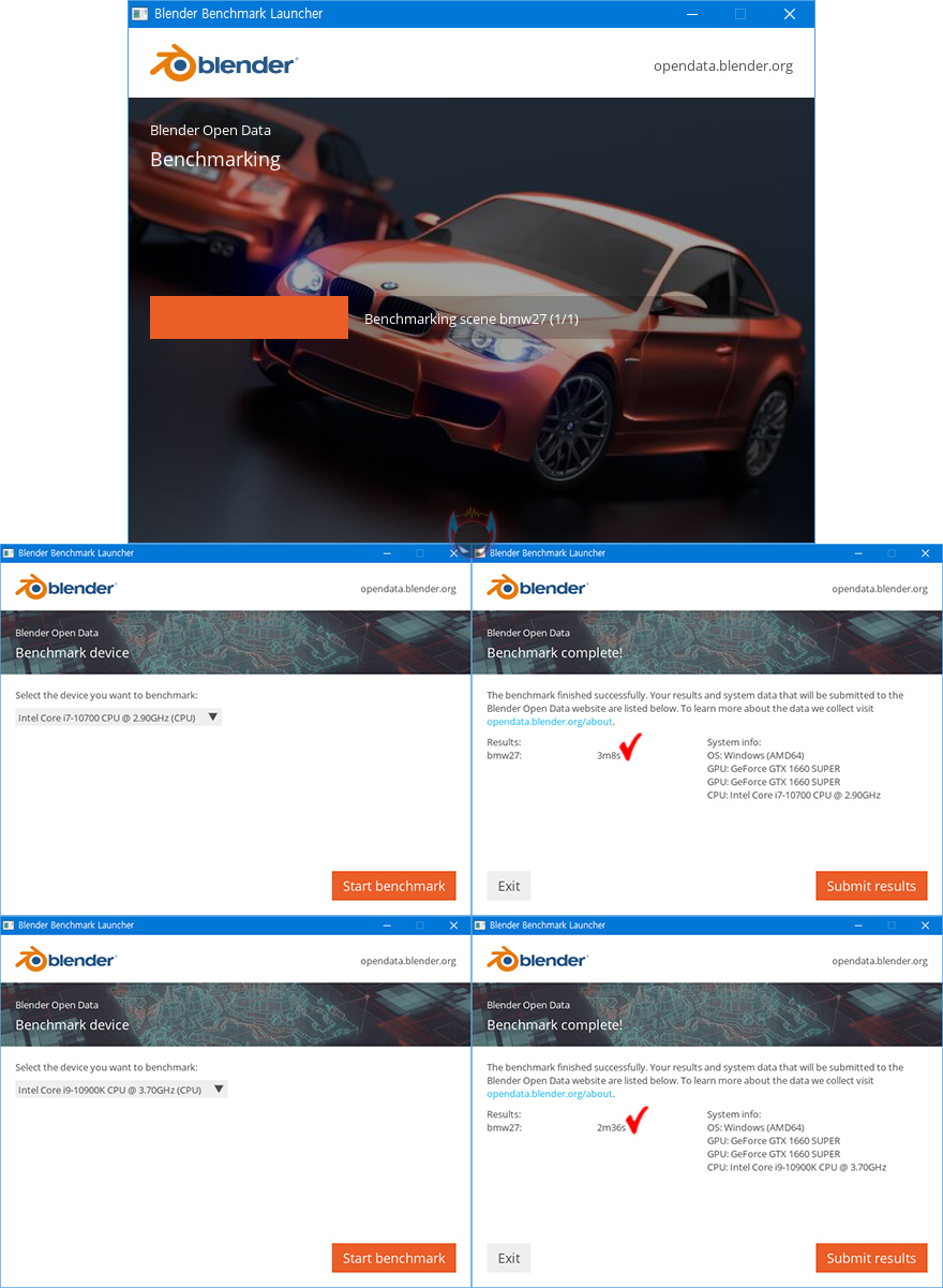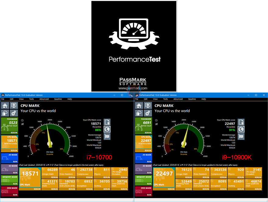 i9-10900K CPU는 i7-10700 CPU보다 코어/쓰레드 모두 더 많죠. 당연히 성능이 앞선다라는 것을 쉽게 짐작할 수 있습니다. 그래서, 이런 코어와 쓰레드의 차이를 통한 성능 차이를 쉽게 알 수 있는 벤치마크 4종을 먼저 실행해보면, 단순한 CPU 연산작업뿐만 아니라 렌더링 같은 작업이나 전체 시스템 그리고 게임 같은 그래픽 성능에서도 CPU의 영향이 코어와 쓰레드 차이에 따라 다르다라는 것을 알 수 있고, i9-10900K가 역시 그 성능을 입증해 줍니다.