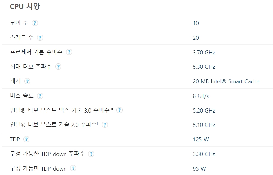인텔 10세대 i9-10900K CPU 외형은 이전 세대의 CPU와 외형적인 차이는 없습니다. 대신에 소켓부분에서 LGA 1151에서 LGA1200으로 접지부분이 더 늘어났죠. 인텔 공식 홈페이지에 등록된 i9-10900K CPU의 스펙정보를 확인해보면, 10코어/20쓰레드 구조로 기본클럭은 3.7GHz로 작동하면 최대 부스터는 5.3GHz까지 작동됩니다. 물론, 여기서 말하는 부스터 클럭은 10코어 모두가 5.3GHz로 작동되는게 아니라 1~2코어가 최대 작동되는 클럭을 의미하죠. 그리고, TDP 설계전력은 125W를 가졌습니다.