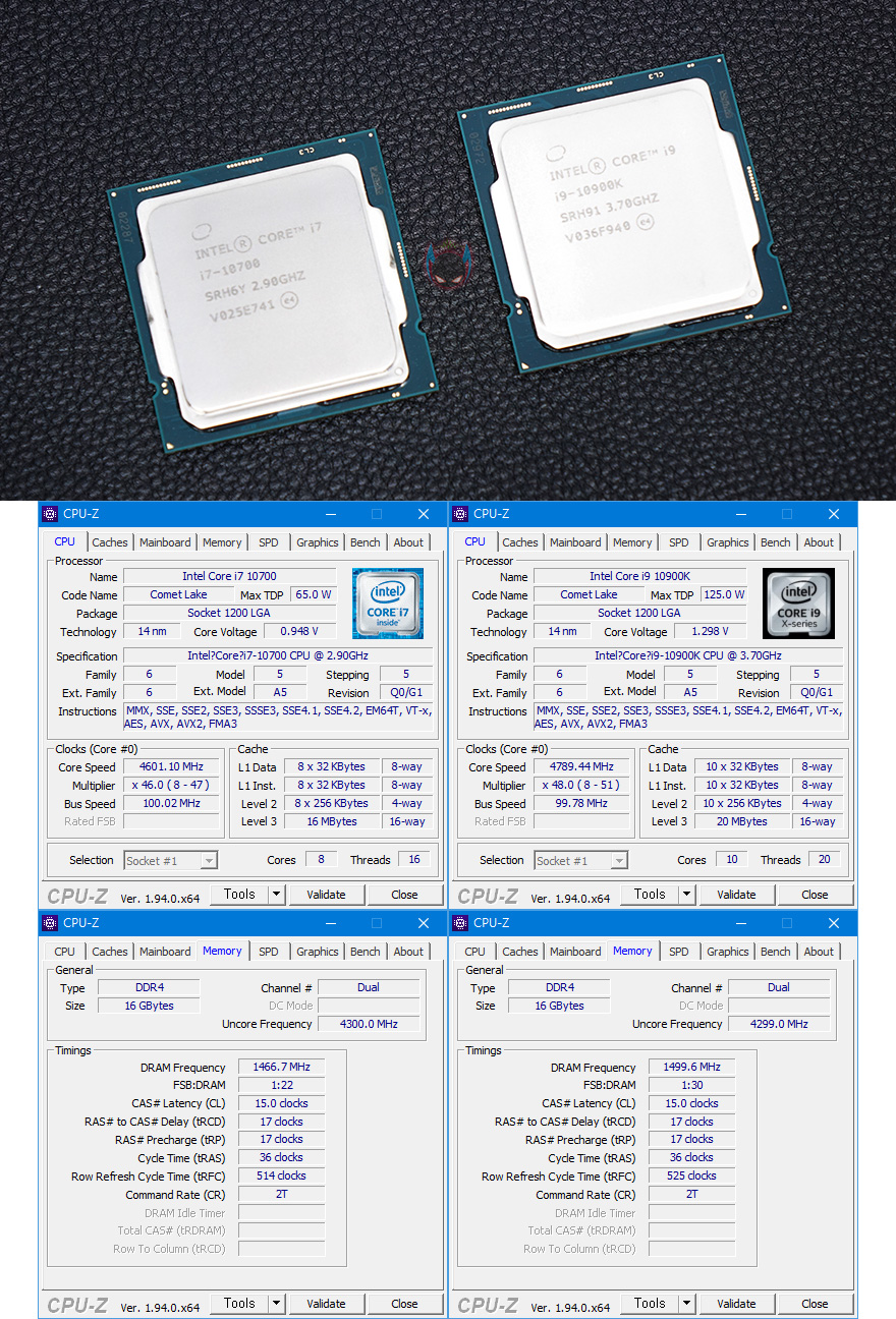 그럼, 이제 인텔 10세대 i9-10900K CPU의 성능을 확인해보는데, i9-10900K는 위에서 잠깐 언급했듯이 오버클럭을 지원하는 K-CPU이기때문에 Z490칩셋 메인보드를 사용해야합니다. 그리고, 비교대상으로 한 단계 아래인 i7-10700 CPU로 8코어/16쓰레드 구조를 가졌습니다. 기본 설정상태에서 먼저 성능확인을 해볼텐데, i9-10900K 같은경우 기본설정으로 사용하면 3.7~4.8GHz 범위에서 주로 작동되며, i7-10700 CPU는 3.2~4.6GHz 범위에서 주로 작동됩니다. 그리고, i7-10700 같은경우 Non-K CPU이기 때문에 최대 메모리 클럭도 2933MHz까지 지원하는 반면, i9-10900K는 그이상의 클럭까지 사용할 수 있죠. 실제 사용하는 메모리의 클럭은 3000MHz으로 i9-10900K에서 3000MHz으로 인식되지만, i7-10700에선 2933MHz으로 인식되는 것을 확인할 수 있습니다.