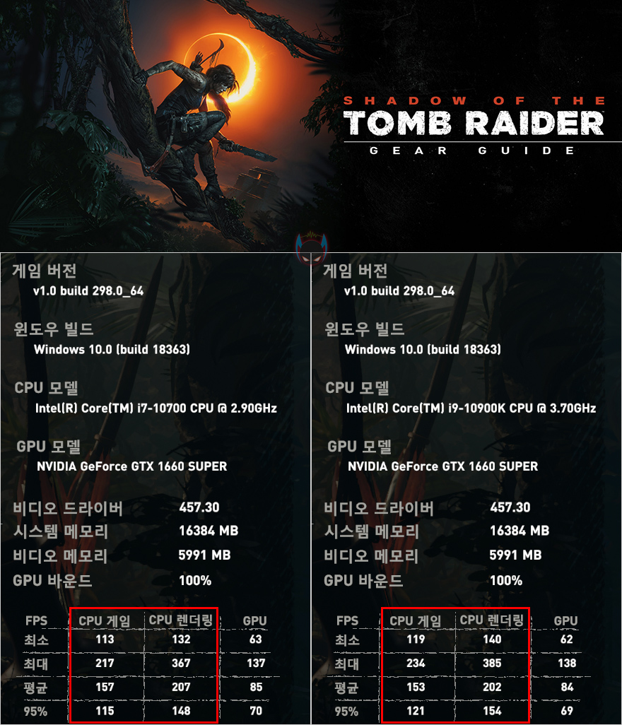 인텔 i9-10900K CPU의 성능은 게임에서도 그 입증을 해주는데, 다이렉트X 12기반 게임 4종의 프레임 벤치마크를 실행해보면, 게임마다 프레임 차이는 각기 다르지만, i7-10700 CPU보다 i9-10900K CPU를 사용했을 때 전반적으로 프레임이 더 높게 나오는 것을 확인할 수 있습니다. 물론, 게임마다 CPU영햐을 받는 것은 모두 다르기 때문에, 어떤 게임에서 얼마만큼의 CPU 코어와 클럭을 사용하는가에 따라서 체감은 다르다 할 수 있습니다.