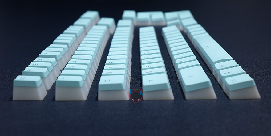 푸딩 디자인을 제외하고 기본적인 키-캡 프로파일 디자인은 체리 MX 스위치 기준에 맞춰서 만들어졌습니다. 물론, +자 모양의 스위치에선 대부분 호환이 된다고 보면 되겠죠. 그리고, 기본적으로 키 높이 역시 MX 스위치 기준에 맞춘거라 측면에서 보면 스텝-스컬처2 단계배열을 갖추도록 해주고 있습니다. 조금 아쉬운 점이라면 제품명에서도 확인했듯이 PBT 재질의 이중사출로 처리된 키-캡이지만, 키-캡 두께를 측정해보면 약 1.1mm대로 조금 얇은 편입니다. 그래서, 얼핏 만져봤을 때는 ABS 키-캡 느낌도 듭니다. 좀 더 두꺼웠으면 좋지 않았을까 생각이 드네요.