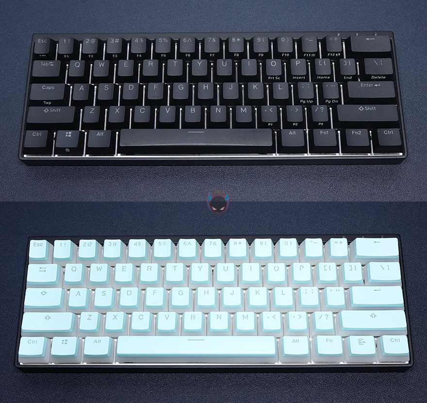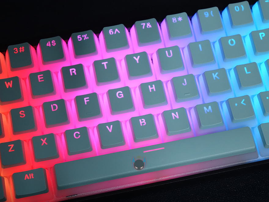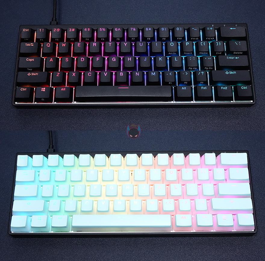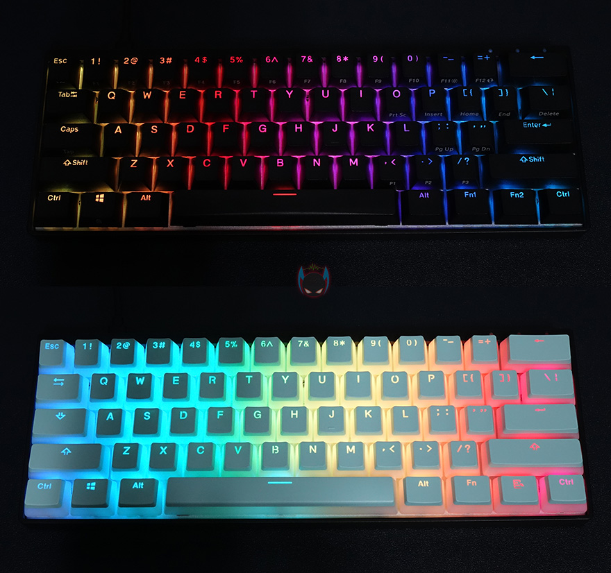 그럼, 직접 HK-Gaming 푸딩 키-캡을 사용해봐야겠죠. DURGOD 비너스 미니 키보드의 키-캡 색상이 블랙색상이기 때문에 한 번 교체하면서 비교를 해봤는데, 밝은 블루계열이라 키-캡만 교체해도 키보드 전체가 밝은 느낌이 듭니다. 여기에 RGB 라이팅효과까지 적용해 비교를 해보면, 밝은 블루계열이라 조명이 있는 곳에서는 아무래도 라이팅효과가 극대화되지만, 키-캡 자체의 밝은 블루색상 느낌은 오히려 화이트 키-캡 느낌으로 좀 더 느낄정도로 기본 색상의 반감이 생깁니다. 하지만, 어두운 곳에서는 확실히 라이팅 효과가 극대화 되는 느낌을 잘 살려주고 있어서 폰트 확실히 더 쉽죠. 확실히 푸딩 키-캡은 조명이나 주변 밝기에 따라서 선택 색상이 달라진다라는 것을 알 수 있습니다.