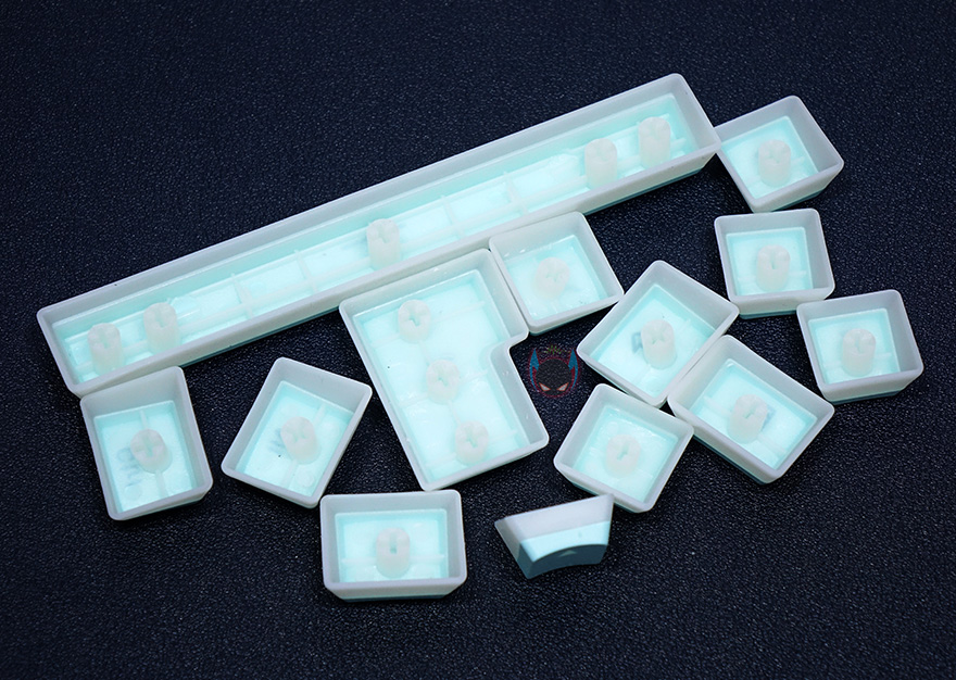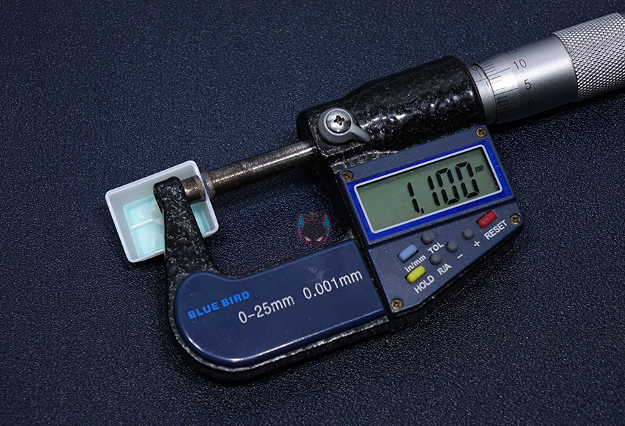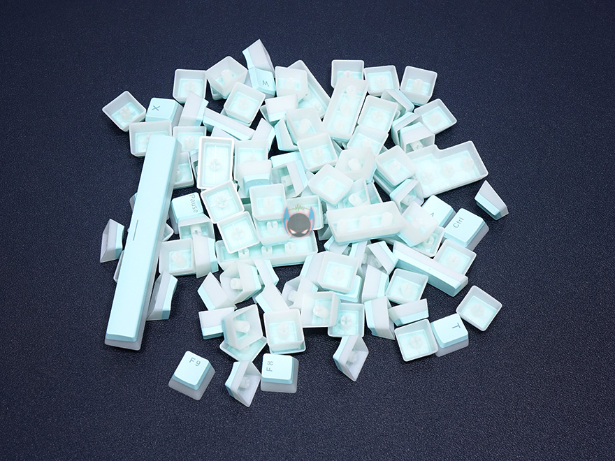푸딩 디자인을 제외하고 기본적인 키-캡 프로파일 디자인은 체리 MX 스위치 기준에 맞춰서 만들어졌습니다. 물론, +자 모양의 스위치에선 대부분 호환이 된다고 보면 되겠죠. 그리고, 기본적으로 키 높이 역시 MX 스위치 기준에 맞춘거라 측면에서 보면 스텝-스컬처2 단계배열을 갖추도록 해주고 있습니다. 조금 아쉬운 점이라면 제품명에서도 확인했듯이 PBT 재질의 이중사출로 처리된 키-캡이지만, 키-캡 두께를 측정해보면 약 1.1mm대로 조금 얇은 편입니다. 그래서, 얼핏 만져봤을 때는 ABS 키-캡 느낌도 듭니다. 좀 더 두꺼웠으면 좋지 않았을까 생각이 드네요.