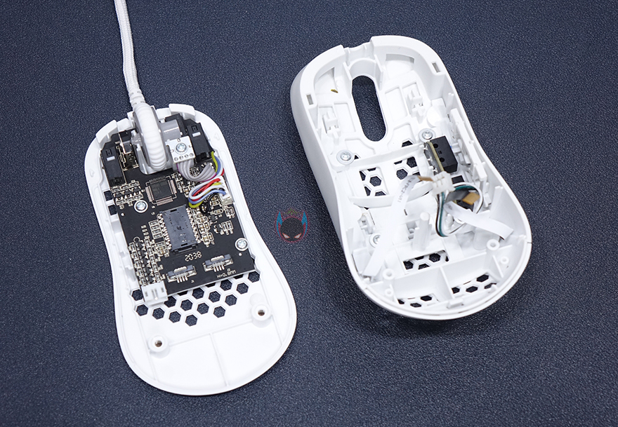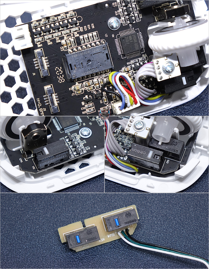 NAOS-M 게이밍 마우스 내부를 잠깐 살펴보면, 박스에서 이미 확인했듯이 광-센서부분은 상반기 모델들과 동일한 PixArt사의 PMW3360을 적용했으며, MCU 컨트롤 칩셋은 BY8948-00006이라고 표기되어 있는데, 정확히 제조사는 알 수 없지만, 초경량 마우스로 맨 처음 나온 G사의 제품에도 동일하게 사용되던 칩셋입니다. 그리고, 기본 좌우버튼 스위치는 OMRON 스위치가 사용되었는데, 상반기 모델과 달리 클릭수명은 2천만회로 반정도 줄어들었죠. 그래도 2천만회면 여전히 클릭수명은 긴 편입니다. 휠-버튼과 측면 버튼은 모두 HUANO 스위치가 사용되었고, 내부 구조에서 조금 아쉬운 점이라면 기본 좌우 클럭버튼의 커버 내부 모양이 ㅁ자가 아닌 일반적인 ㅗ자 형태로 면적이 조금 아쉽다 할 수 있겠습니다.