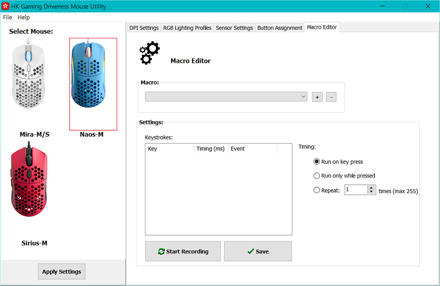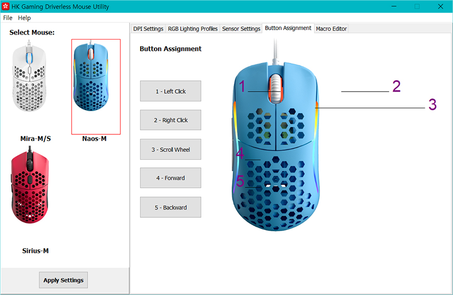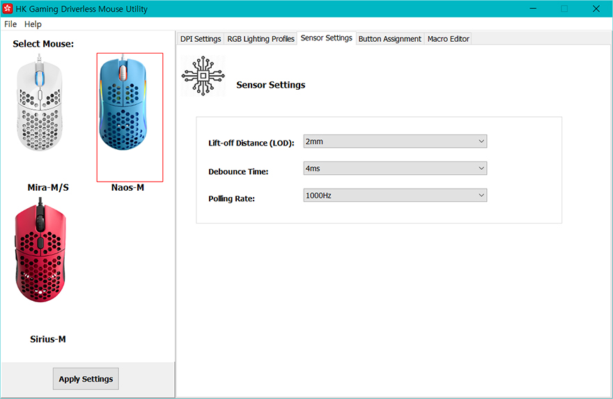 NAOS-M부터는 공용 소프트웨어가 바뀌었느데, 좀 더 인터페이스가 보기 쉬워졌습니다. 그리고 DPI와 RGB 설정을 외에 추가적으로 센서와 버튼, 매크로 설정을 할 수 있는데, 센서는 LOD과 디바운스 타임, 전송제어속도 조절을 할 수 있으며, 버튼설정 같은경우에는 기본 좌우버튼, 휠-버튼, 측면 버튼 총 5개의 버튼 모두 사용자가 기능변경할 수 있습니다. 최근에 버튼 기능변경을 지원하는 제품들이 기본적으로 왼쪽버튼을 고정으로 변경할 수 없게 지원하는 경우가 많아졌는데, 이 제품은 기본 왼쪽 버튼까지 변경할 수 있다라는 점에서 일부 소비자에겐 어필이 될 수 있는 부분이라 생각됩니다.