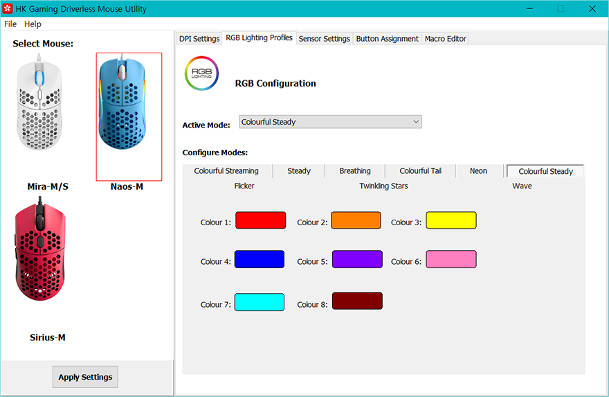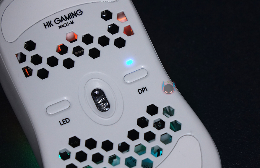 실제로 HK-Gaming NAOS-M 게이밍 마우스를 사용해보면, PC와 연결하면 바로 기본적으로 RGB 라이팅효과를 휠-버튼과 양쪽 측면 윗부분 라인형태로 확인할 수 있습니다. 위에서 언급했듯이 LED모드는 Off를 포함해 총 10가지 모드를 지원하는데, LED 버튼을 통해서 쉽게 모드 전환을 할 수 있고, 세부적인 설정은 프로그램을 통해 변경할 수 있습니다. 그리고, DPI버튼은 총 6단계로 설정할 수 있는데, 최대 12,000DPI까지 지원합니다. RGB 라이팅부분을 제외하면 모두 상반기 모델들과 기능적인 부분에선 차이가 없다고 할 수 있죠.