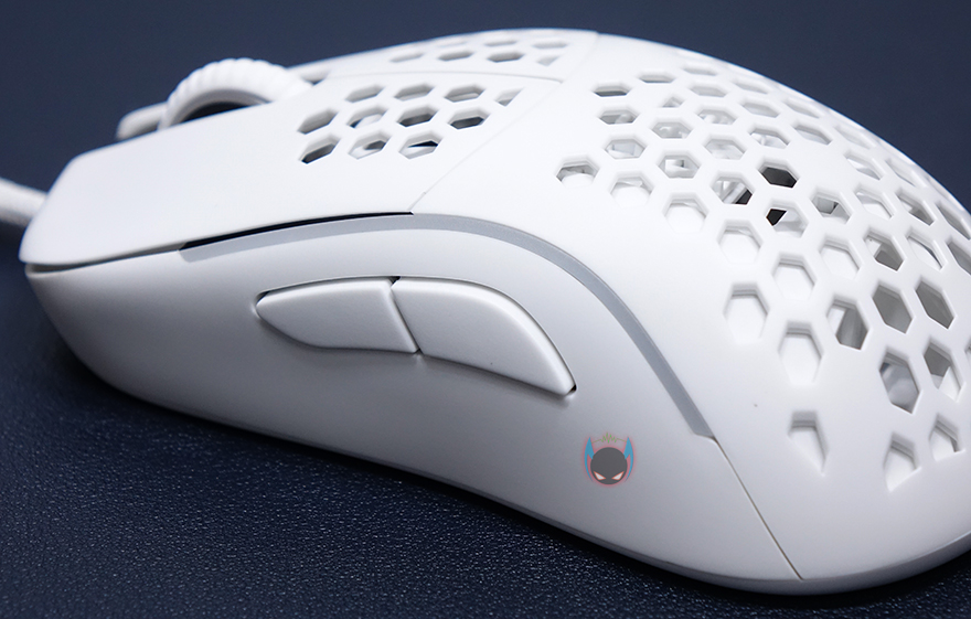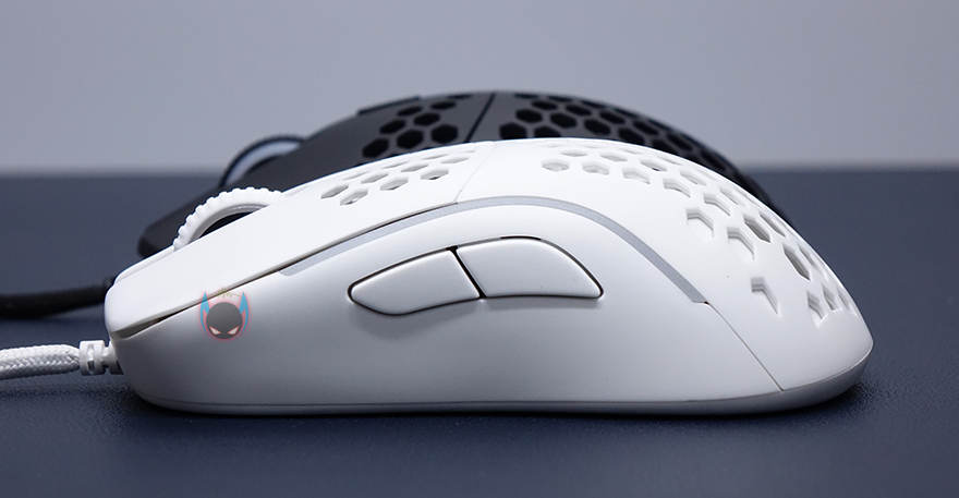HK-Gaming NAOS-M 게이밍 마우스를 살펴보면, 일단 색상은 블랙, 화이트, 블루, 핑크 총 4가지 색상으로 출시되었으며, M이 의미하는게 미들이라서 상반기에 먼저 출시했던 MIRA-M과 크기를 비교해보면 길이는 NAOS-M이 조금 더 짧은 것을 확인할 수 있고, 측면에서 보면 높이차이가 확연하게 NAOS-M이 더 낫다라는 것을 확인할 수 있죠. 비슷한 크기와 무게를 가졌지만, 높이에서 차이가 나기 때문에 사용자 취향에 따라 선택될 수 있는 부분입니다. 그리고, 측면과 상판의 경계부분에 양쪽 모두 라이팅효과를 볼 수 있게 디자인처리 되어있죠. 그리고, 왼쪽 측면에는 추가 버튼 2개가 배치되어 있습니다.