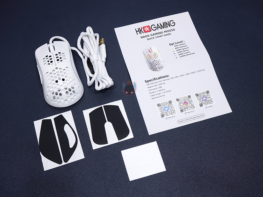 박스를 열어보면, 제품 포장 역시 상반기 출시한 모델들과 동일한 방식인 것을 알 수 있고, 제품구성도 NAOS-M 마우스를 제외하고 나머지 구성품들이 동일하다라는 것을 알 수 있는데, HK-Gaming 게이밍 마우스 제품들은 모두 여분의 테프론-피트와 타공망 처리가 많기 때문에 기본 좌우버튼과 측면 그립 커버할 수 있는 먼지 커버 패드를 함께 제공해주고 있죠. 이런 제공들은 소비자입장에서 좋은 점이라 할 수 있습니다.
