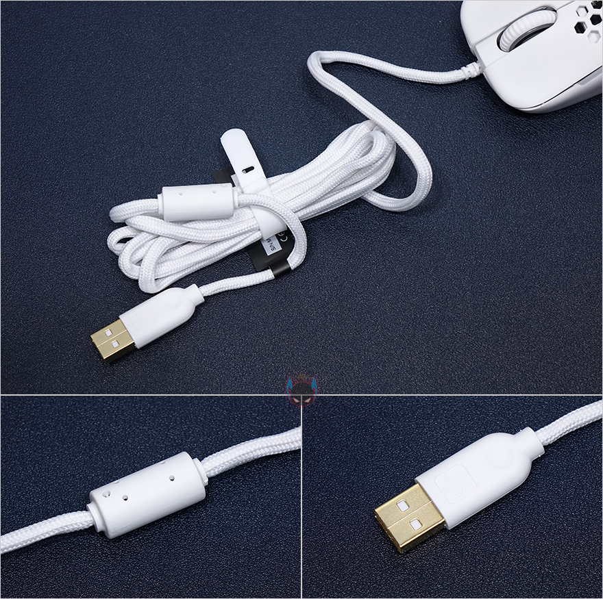 그리고, 상반에서 사라진 DPI 버튼은 마우스 밑바닥부분에 적용되어 있죠. 그리고, 추가로 LED버튼도 적용되었는데, 뒤에서 확인하겠지만, LED 모드는 총 10가지를 갖추고 있습니다. 그리고 역시 밑바닥부분도 타공망 디자인을 일부 적용하고 있으며, 위아래로 큼지막한 테프론-피트가 부착되어 있습니다. 케이블은 총 1.8m 길이에 전체 패브릭 재질로 슬리빙 처리를 했고, 신호손실을 위한 노이즈 필터와 USB 인터페이스 금도금 처리도 적용된 것을 확인할 수 있습니다.