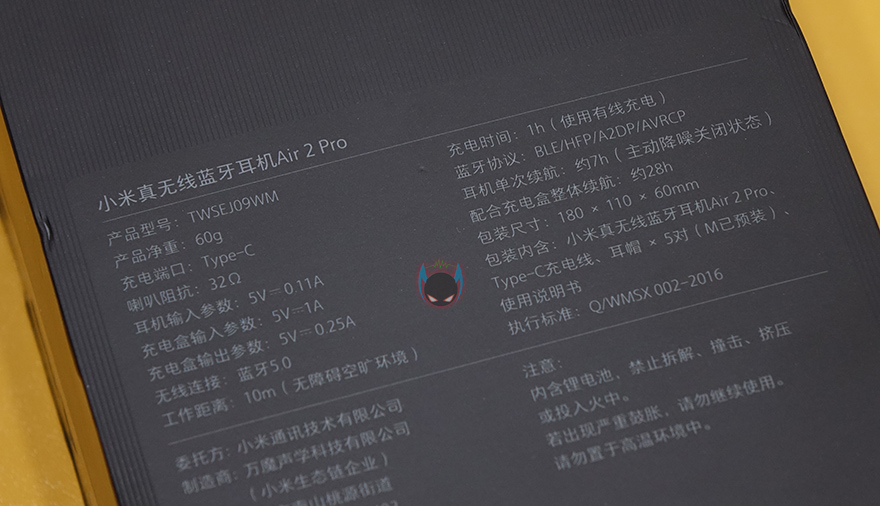 블랙색상의 박스디자인에서 전면에는 샤오미 Air2 Pro 이어폰 이미지를 담고 있으며, 박스 후면에는 제품 사양을 확인할 수 있는데, 무게라든지 저항, 충전 전압, 블루투스 버전, 충전 시간, 충전 케이스 크기 등을 확인할 수 있습니다. 그리고, Air2 Pro 같은경우 현재 중국에서만 판매되는 내수용 버전이기 때문에 샤오미 Ai 음성 지원을 하며, Qi 무선 충전표시도 확인할 수 있습니다.