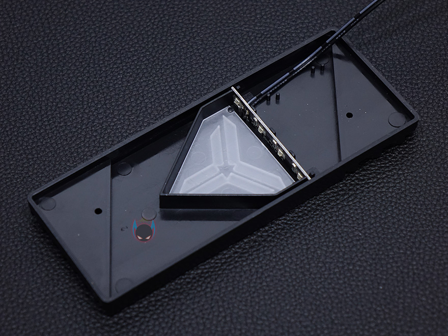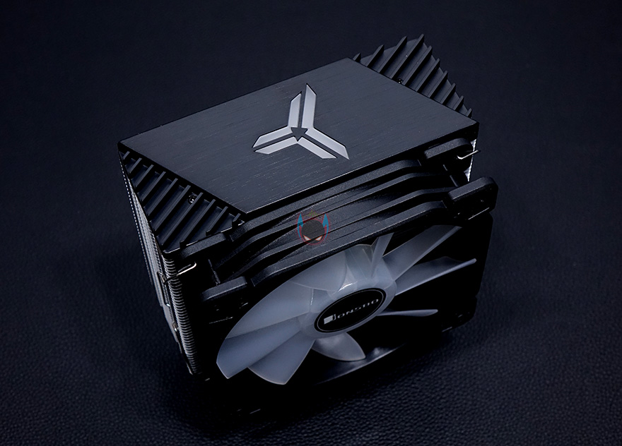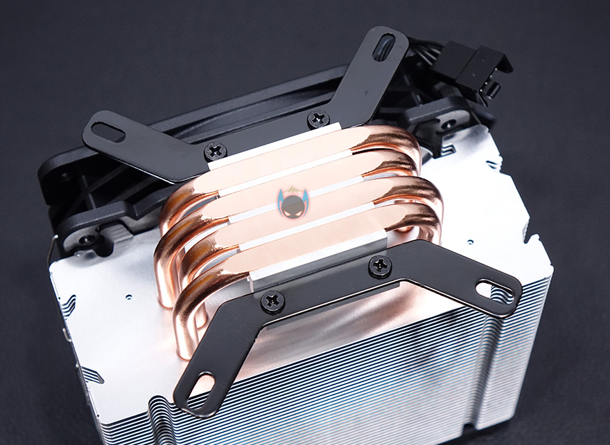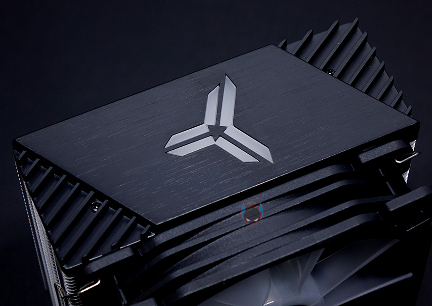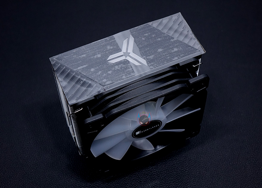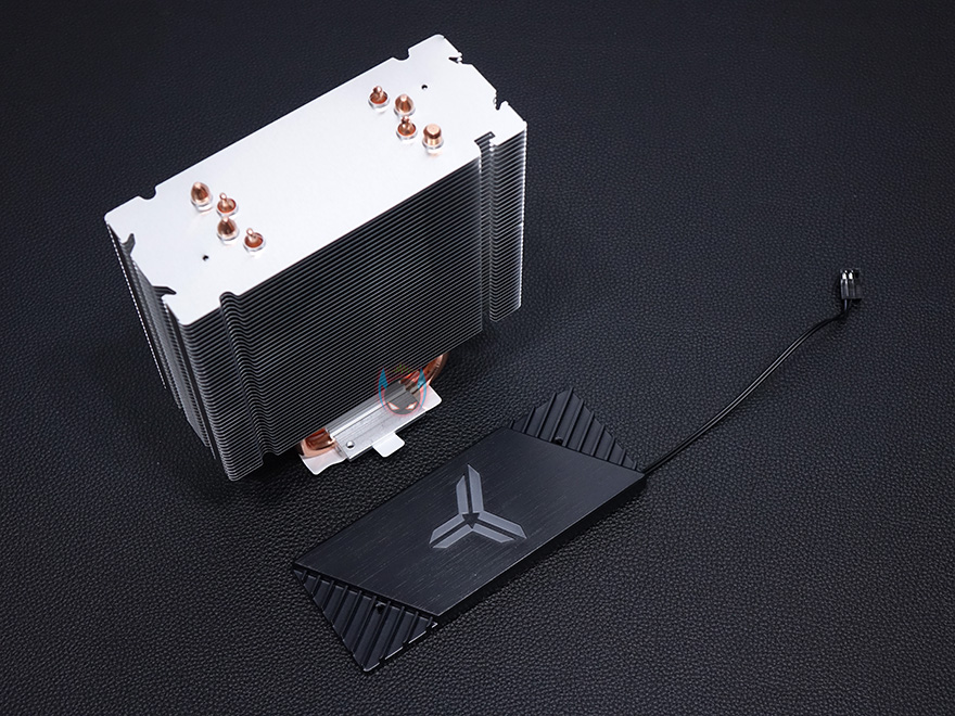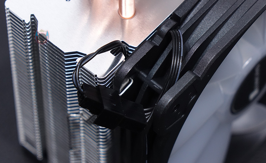 쿨러 맨 상단에는 상판을 적용했는데, 개봉 시에는 보호비닐이 부착되어 있으며, 비닐을 제거하면 블랙 색상 기반 상판 중심에 로고 디자인이 적용된 것을 확인할 수 있습니다. 로고 부분 역시 LED 효과를 볼 수 있게 지원하고 있어서, 케이블이 팬 케이블과 연결되면서 최종적으로 팬 케이블 하나로 팬과 로고의 LED과 함께 작동되는 방식인 것을 확인할 수 있습니다. 팬을 분리하면 좀 더 쉽게 이해가 되죠?!