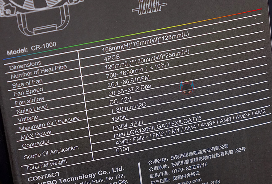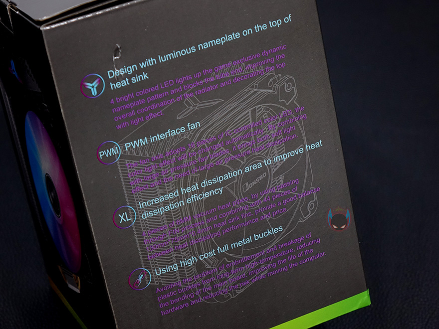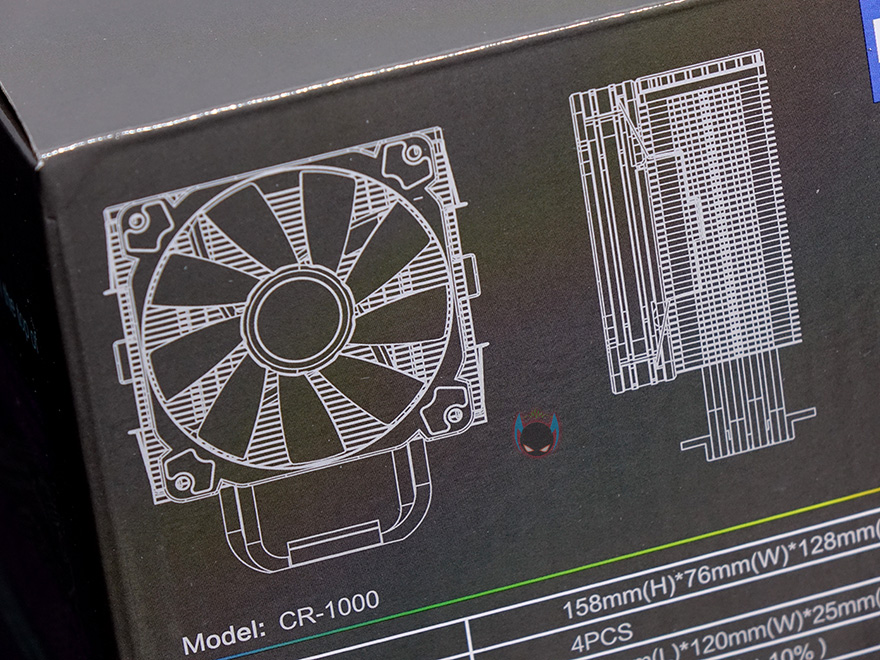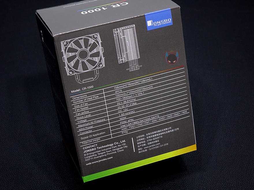 제품박스부터 살펴보면, 전면에 제품 이미지가 삽입되어 있어서 존스보 CR-1000 CPU쿨러가 팬과 쿨러 상판에 LED 효과가 있다라는 것을 알 수 있습니다. 그리고, 박스 측면에는 제품의 주요 특징으로 LED와 히트싱크, 팬에 대해 언급을 하고 있으며, 박스 후면에는 제품의 기본 사양 표기를 확인할 수 있는데, 쿨러 높이를 시작으로 팬의 사양과 소켓 지원, 무게 등 상세하게 표기되어 있어서 구입 전에 충분히 소비자가 정보를 얻을 수 있겠습니다.