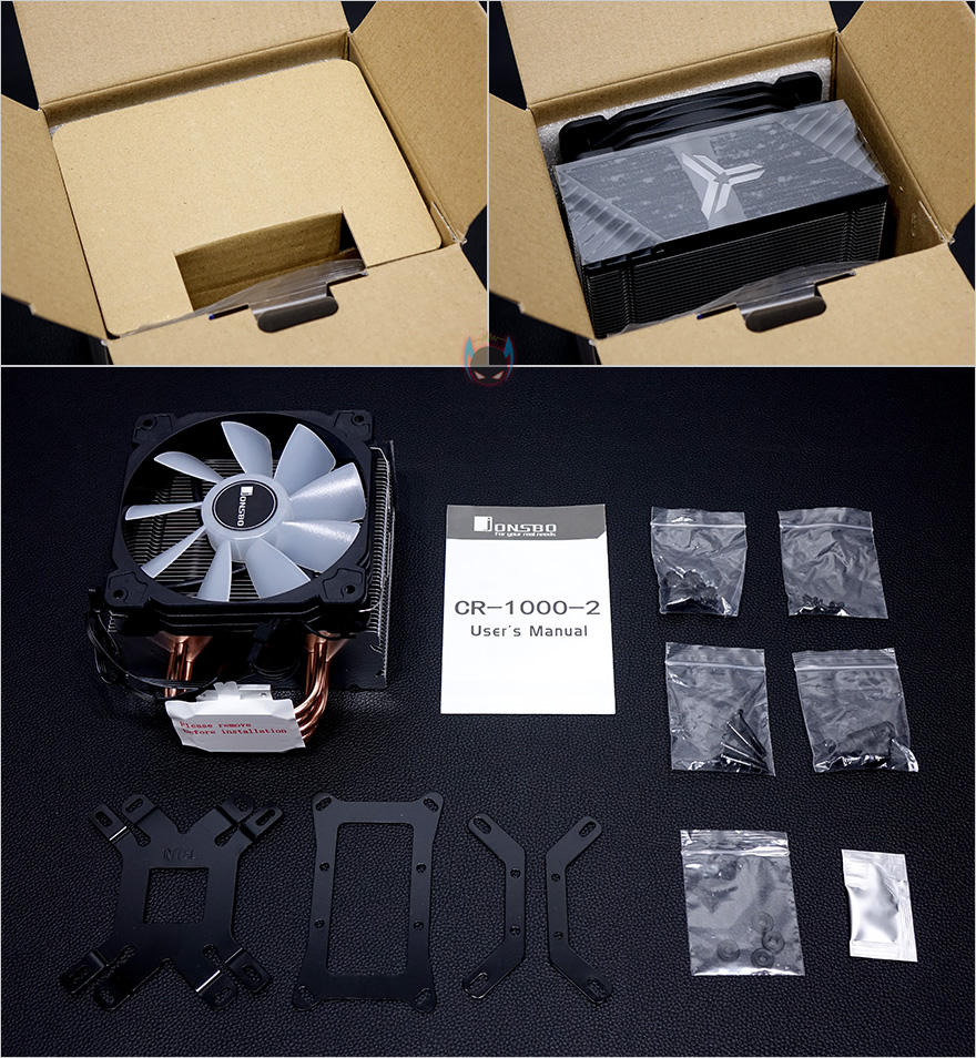 제품 포장은 기본 커버 종이와 쿨러 파손방지를 위해 기본적인 완충재를 사용하고 있으며, CR-1000 CPU쿨러를 비롯해 제품 부속품에는 제품설명서, 인텔/AMD 공용 백플레이트, AMD 브라켓, 인텔 브라켓, 각 사용별로 비닐 포장된 나사들, 써멀컴파운드 제공으로 이루어져 있습니다.