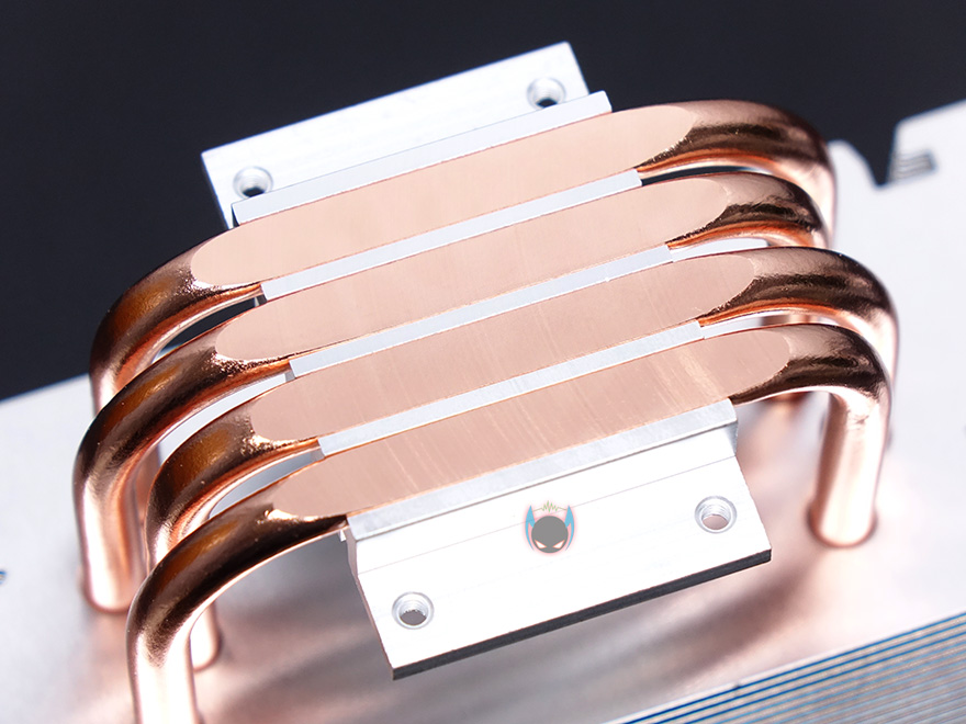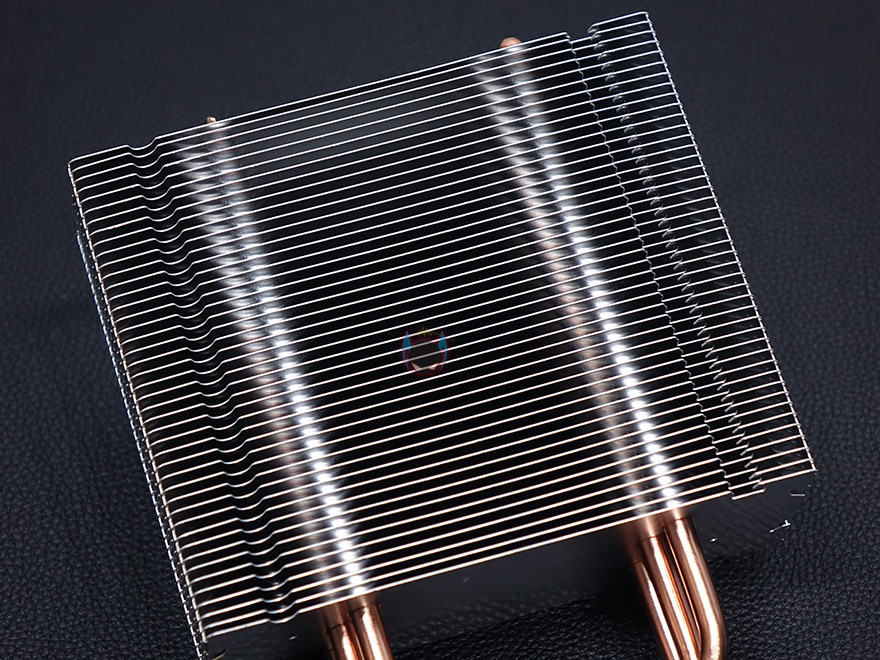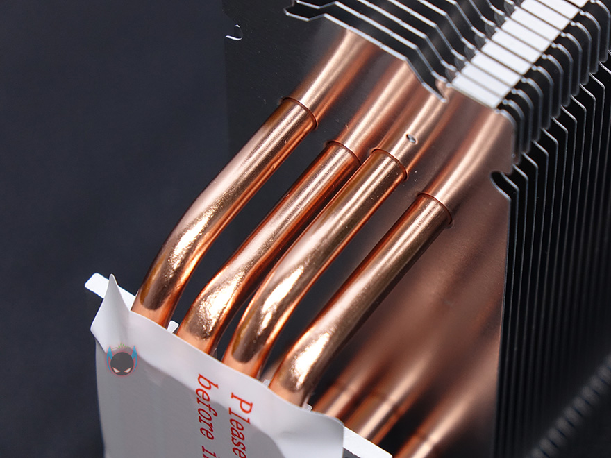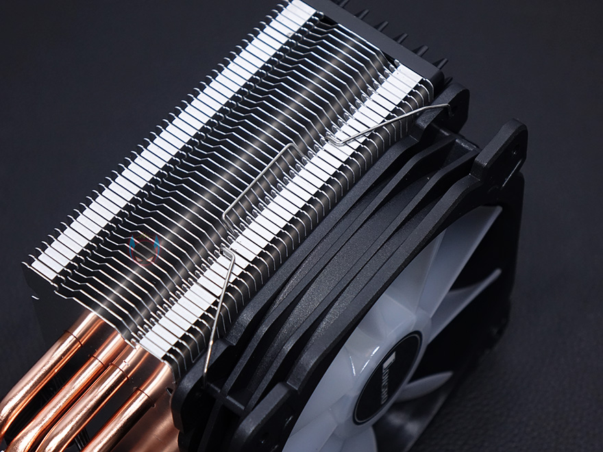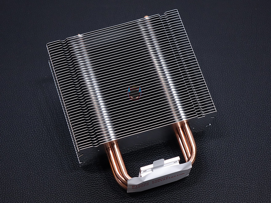 팬과 상판까지 분리된 상태에서 CR-1000 CPU쿨러의 기본 구조 상태를 살펴보면, 전형적인 타워형 쿨러 구조로 히트파이프가 U자 구조로 방열핀을 관통하는데, 방열핀은 총 44개이며, 방열핀 모양을 보면 위에서 언급했듯이 앞뒤로 듀얼 팬 구성을 할 수 있게 양쪽 측면에 홈 처리가 되어 있습니다. 물론, 클립이 한 쌍만 제공되기 때문에 기본적으로는 듀얼 팬 구성을 할 수 없습니다. 그리고, 히트파이프는 총 4개를 사용했으며, 지름은 6mm 입니다. 끝으로, CPU와 맞닿는 베이스부분은 히트파이프가 CPU에 직접 접촉하는 방식으로 래핑처리는 매그럽게 잘 처리되어 있습니다.