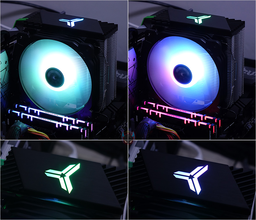 존스보 CR-1000 CPU 쿨러까지 장착한 후 PC를 켜보면, 기본 장착된 120mm 팬과 쿨러 상판 로고부분에서 LED 라이팅 효과를 볼 수 있는데, 동시에 여러 색상이 나오는 방식이 아닌 순차적으로 색상이 바뀌는 형태인 것을 확인할 수 있습니다. 자동으로 전환되기 때문에 따로 LED 모드 설정 같은 지원은 없습니다.