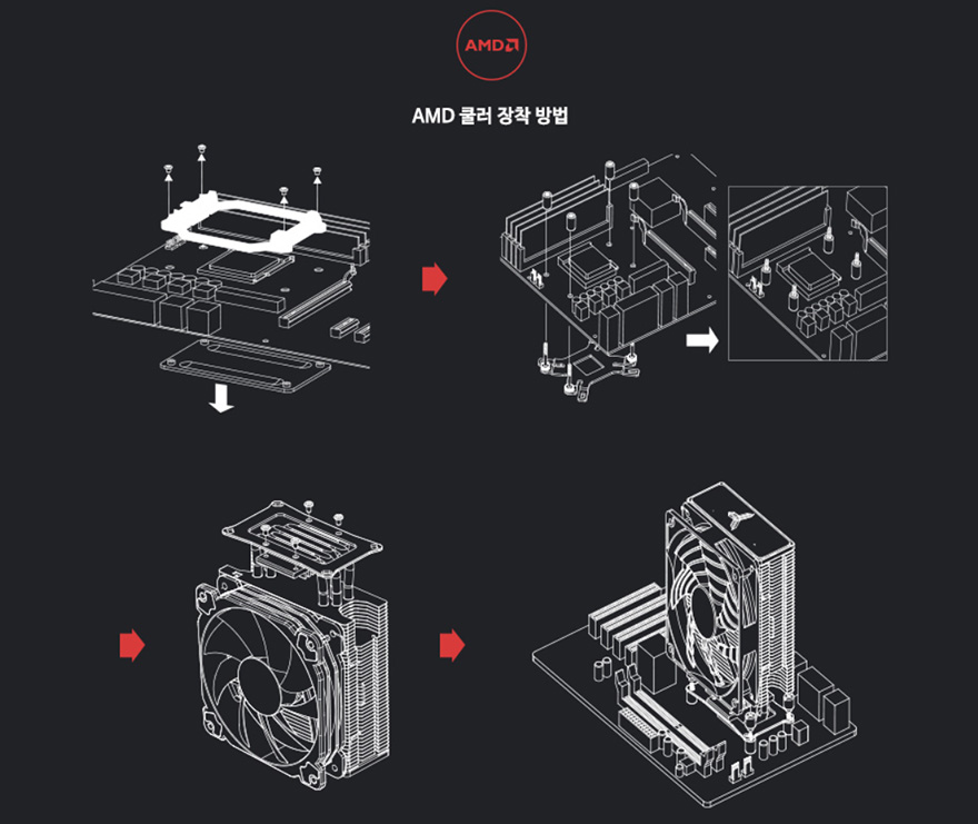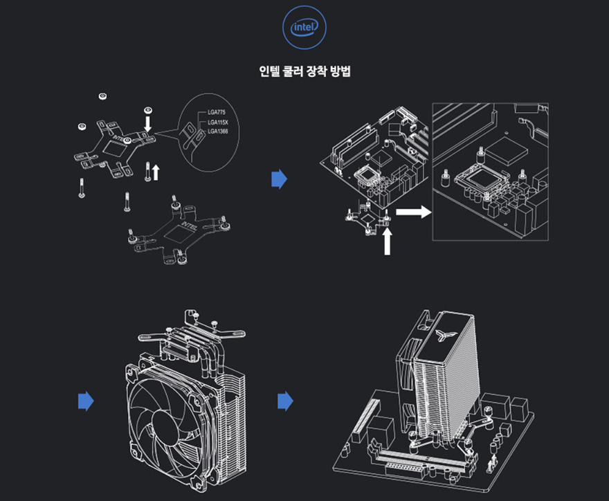 직접, 존스보 CR-1000 CPU쿨러를 사용해보는데, 쿨러 장착법은 상품페이지나 제품설명서를 참고하면 어렵지 않게 장착할 수 있습니다. 저 같은경우에는 인텔 CPU를 사용했기 때문에 인텔 기준에서 설명하자면, 먼저 인텔/AMD 공용 백플레이트에 받침 스크류와 와셔를 결합해줍니다. 그 다음 백플레이트를 메인보드에 결합해줄 때는 제공되는 스탠드-오프(Stand-Off)를 사용하면 되고, CPU쿨러 베이스부분 양쪽에는 인텔용 브라켓을 장착해 준 다음, 쿨러와 메인보드에 결합된 백플레이트를 서로 제공되는 고정 스크류를 사용해서 결합해주면 장착이 마무리 됩니다.