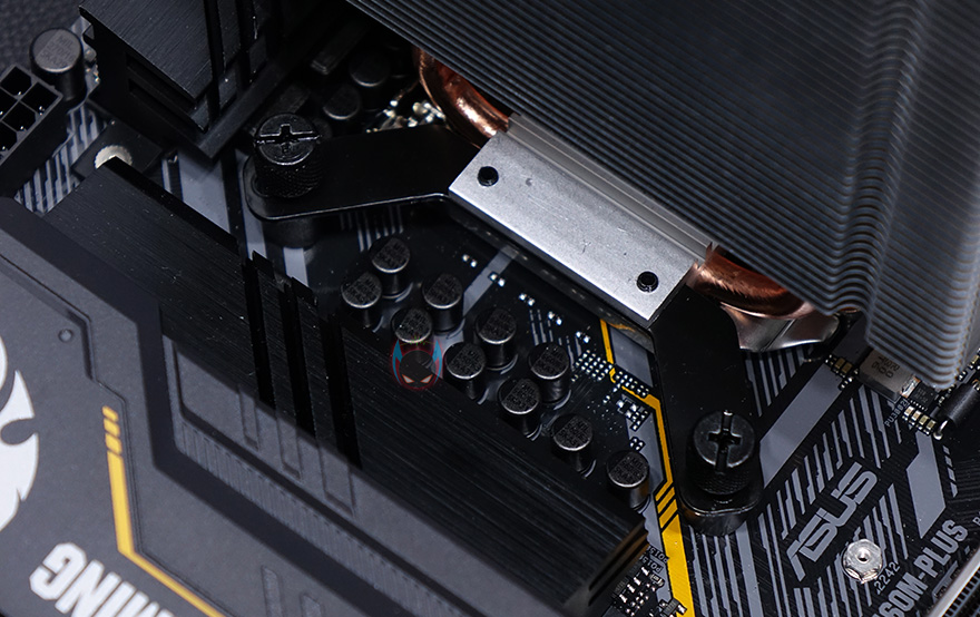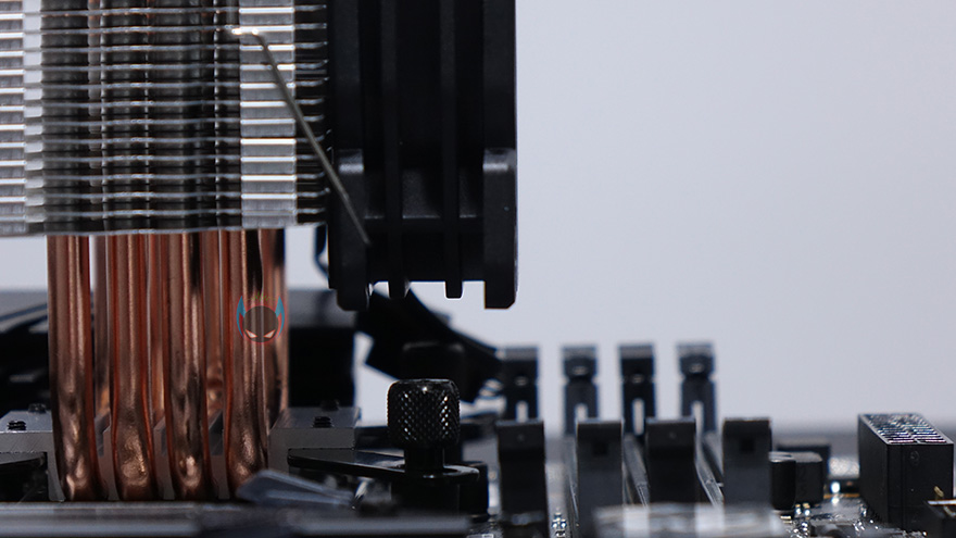 메인보드에 장착 후 팬까지 장착된 상태에서 메모리 슬롯 간섭 여부를 확인해보면, 메모리 1번 슬롯에 간섭이 발생하는 것을 확인할 수 있는데, 팬 높이 조절이 가능하기 때문에 방열판이 없는 일반 메모리는 1번 슬롯에도 장착이 가능하겠지만, 방열판이 있는 메모리는 1번 슬롯에 장착했을 시 간섭이 발생할 확률이 높겠습니다. 나머지 메모리 슬롯은 간섭 발생이 없습니다.