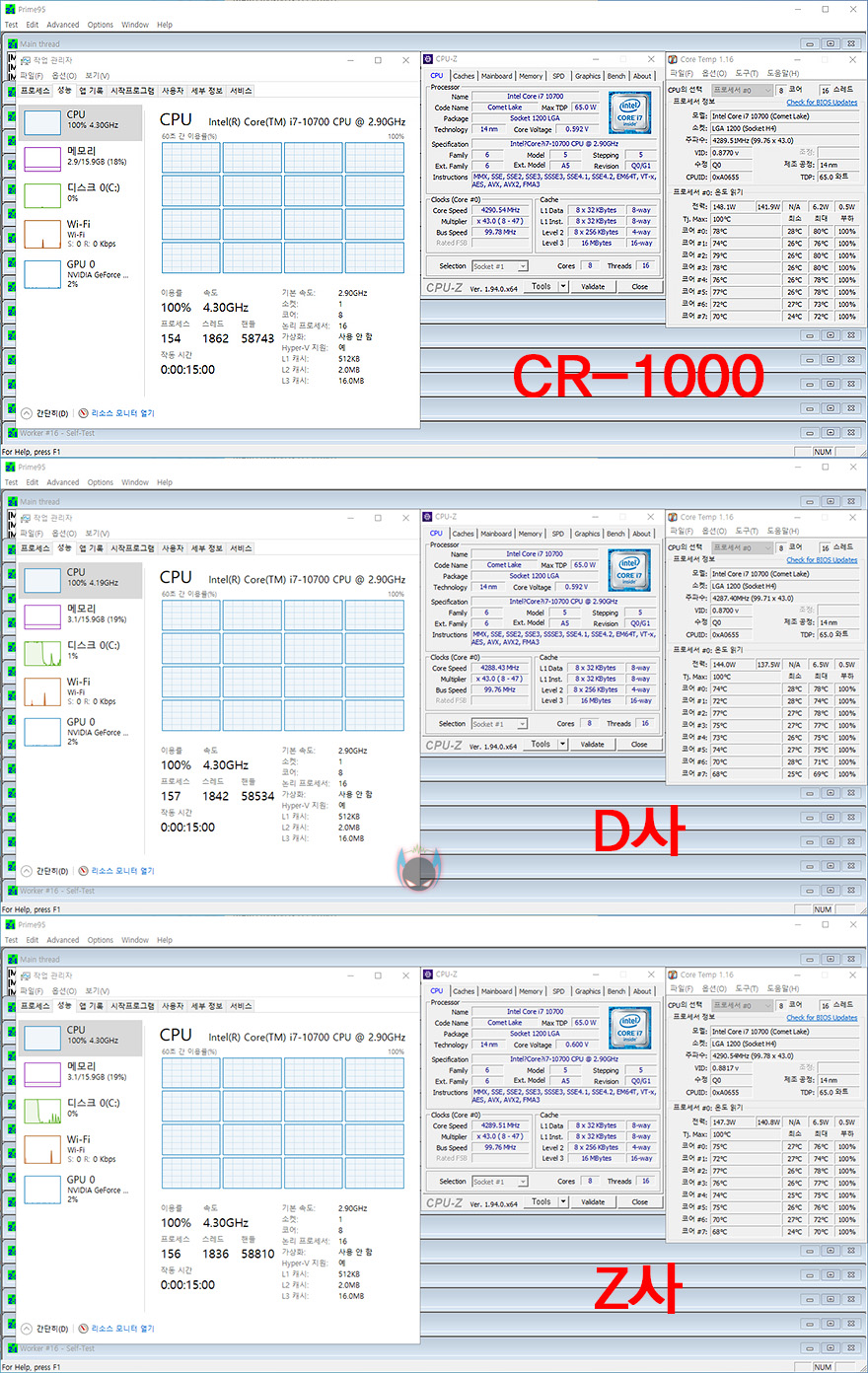 끝으로, 존스보 CR-1000 CPU쿨러의 냉각 성능을 확인해보는데, 비교 대상 모두 4개의 히트파이프 구성의 비슷한 사양의 공랭쿨러 제품들로 했으며, 가겨대도 모두 2~3만원대를 형성하고 있습니다. CPU는 인텔 i7-10700 CPU로 2~3만원대 CPU쿨러지만 그래도 어느정도 안정적인 범위에서의 오버클럭은 3개의 모델 모두 커버가 가능하기 때문에, i7-10700 CPU를 전력해제 시켜 4.3GHz까지 클럭을 높여서 프라임95 프로그램을 통해 IDLE 5분과 LOAD 10분 상황에서의 온도 비교를 해보았습니다. IDLE은 모두 낮은 온도대를 보여주기 때문에 큰 의미가 없고, LOAD 상태일 때 온도 비교를 보면 D사 쿨러 제품이 가장 낮은 74.625℃, 그다음 Z사 쿨러 제품이 74.75℃, 그다음이 존스보 CR-1000 CPU쿨러로 77.125℃ 입니다. 수치상으로 보면 CR-1000 CPU쿨러의 냉각성능이 가장 낮지만, 3개의 모델이 모두 2~3만원대 가격을 형성하고 있다라는 점에서 어느정도 안정적인 오버클럭 범위는 커버를 한다라는 점을 언급했듯이 CR-1000 CPU쿨러도 80℃가 넘지 않기때문에, 2만원대 가격이라는 점에서 보면 보급형 CPU쿨러로 냉각 성능은 충분히 보여줬다 할 수 있겠습니다.