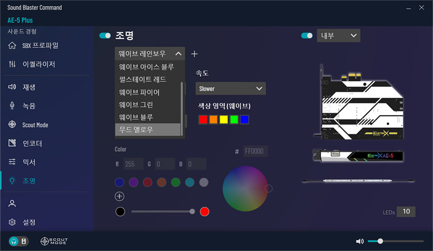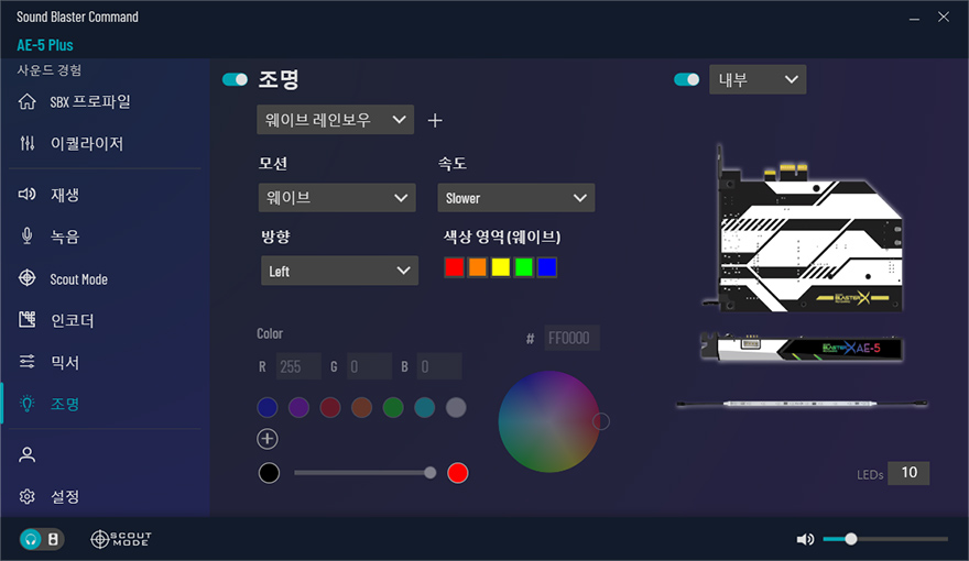 직접, 사운드블라스터X AE-5 Plus를 사용해보면, 일단 PC에 장착해서 켰을 때는 측면 라이팅효과가 단색이지만, 크리에이티브 공용 소프트웨어인 사운드블라스터 커맨드가 실행되면, 사용자가 지정한 라이팅효과로 작동이 됩니다. 물론, 운영체제 진입 시 프로그램을 자동실행 설정해놓으면 매번 프로그램을 실행시킬 필요가 없죠. 그리고, 이전 AE-5 모델과 마찬가지로 사운드블라스터 커맨드-조명 설정을 통해 총 8가지 모드 전환과 모션, 속도, 방향, 색상지정까지 다양하게 사용자가 설정할 수 있습니다. 물론, 함께 제공되는 LED 스트립을 연결해서 사용하면 함께 연동 적용도 됩니다.