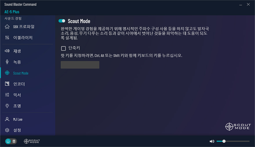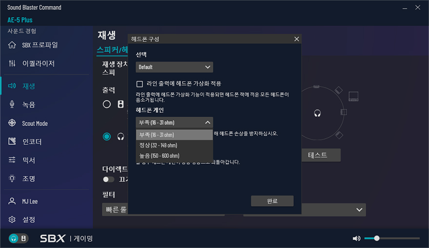 또한, 프로그램-재생 설정을 통해서는 자신이 사용하는 헤드폰에 맞춰서 임피던스 범위를 설정할 수 있는 부분도 상당히 매리트가 있죠. 물론, 요즘 게이밍헤드셋 제품들이 대부분 32Ω을 넘기는 경우가 잘 없지만, 그래도 일부 특정 게이밍 헤드셋이나 전문가용 헤드셋 제품들은 훨씬 높은 임피던스값을 적용하는 경우가 있기때문에 이런 헤드셋 제품을 사용하는 사용자들에게는 좀 더 선명하고 정확한 사운드 전달을 해줄 수 있겠습니다. 물론, 오디오 음질도 최대 32비트까지 설정할 수 있죠. 또한, FPS게임을 좋아하는 분들이라면 발소리나 무기 장착 소리에 민감하게 반응하기 때문에 이런 사운드를 강조해주는 스카우트 모드도 AE-5 Plus에서도 유지되기 때문에 유용한 기능 중 하나입니다. 단, 스카우트 모드를 활성화하면, SBX 프로파일과 이퀄라이저 기능은 비활성화 됩니다.