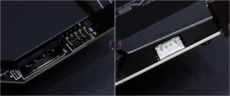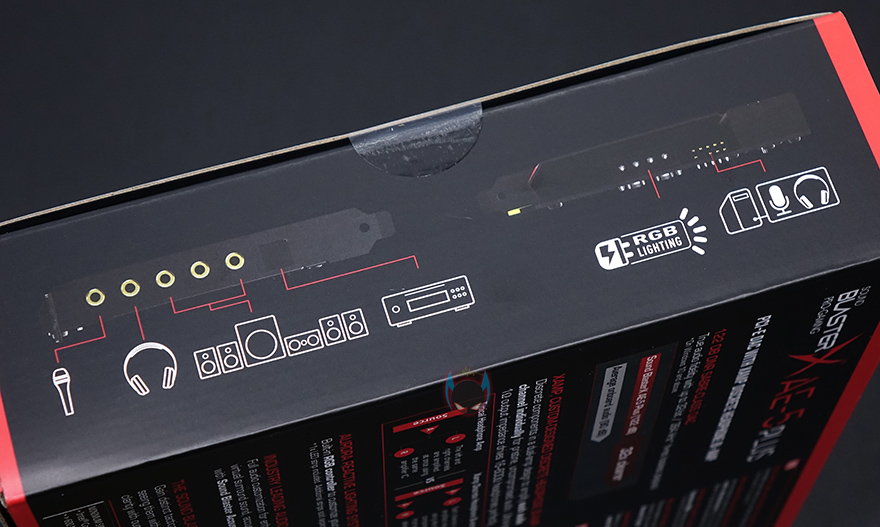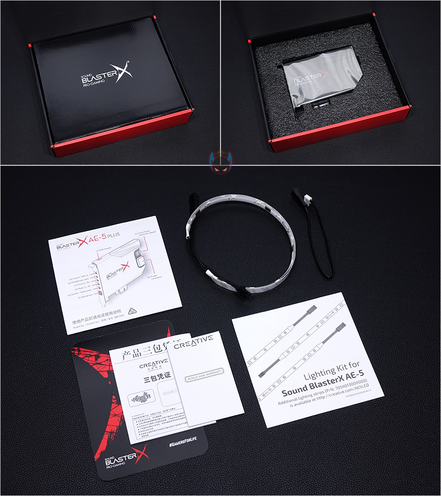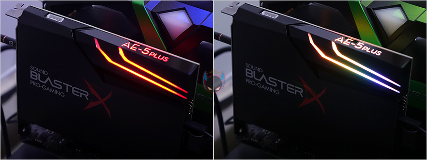 사운드블라스터X AE-5 Plus 역시 내부 칩셋부분들을 보호하기 위해서 메탈 커버를 적용하고 있으며, 오른쪽 한 부분에 크리에이티브 자체에서 지원하는 RGB 라이팅 기술 Aurora를 시각적으로 볼 수 있는 디자인처리가 적용되어 있습니다. 그래서, AE-5 모델때와 마찬가지로 AE-5 Plus에서도 LED 스트립을 제공해주고 있고, 연결방식도 측면 RGB헤더 커넥터에 연결하는 방식으로 동일합니다. 내부쪽 측면에는 RGB 라이팅효과를 위한 P-ATA 전원커넥터와 PC케이스 오디오 포트와 연결되는 커넥터가 배치되어 있으며, PCI슬롯 바깥쪽에는 기본 오디오 및 마이크, 헤드폰, 5.1채널 스피커 오디오, 광출력 포트가 배치되어 있습니다.