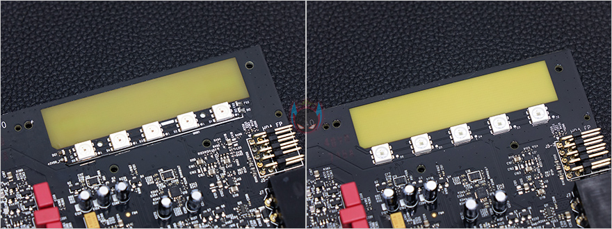 사운드블라스터X AE-5 Plus 메탈 커버를 분리해서 내부 PCB기판 부분을 살펴보면, 칩셋 및 DAC, 캐패시터 부분들이 이전 AE-5 모델과 동일한 구성인 것을 확인할 수 있습니다. 이미 시작에서 가장 큰 차이점은 인코딩 지원이라고 언급을 했었죠. 사실상 인코딩 지원을 제외하면 동일한 사양입니다. 그래도, 눈에 띄는 점은 측면 네이밍부분의 라이팅효과를 위한 LED처리가 이전 AE-5 모델에선 사운드카드 PCB기판 자체에 SMD를 바로 적용한 형태였는데, 이번 AE-5 Plus 모델에선 따로 분리해서 SMD PCB기판을 사용했습니다. 이렇게하면 아무래도 나중에 LED부분에 문제가 생겨도 수리하기가 한결 수월해질 수 있죠.