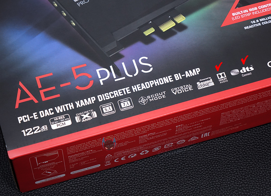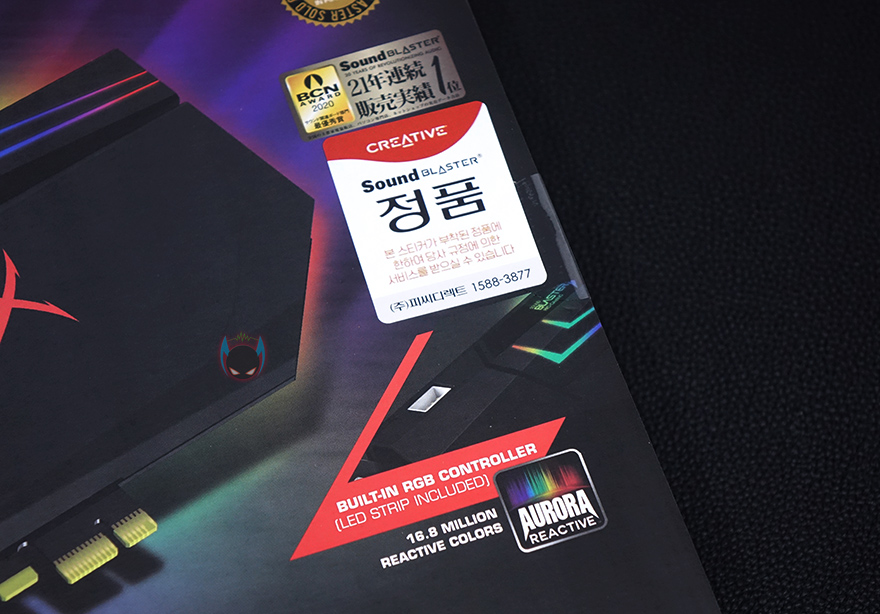 사운드블라스터X AE-5 Plus의 제품박스는 기존에 먼저 나왔던 AE-5 모델과 거의 동일합니다. 제품 이미지라든지 기존 모델에서 지원하던 기술이나 기능들 표기를 그대로 표기해놨다라는거죠. 물론, 모델명이 다르고, 제품의 주요 특징에서 돌비 오디오와 DTS 지원이 추가되었다라는 표기도 새롭게 확인할 수 있습니다. 그리고, 국내에는 최근 CPU와 메인보드 유통사로 유명한 피씨디렉트 업체에서 Creative 제품들도 유통을 시작하고 있어서, 정품 스티커도 확인할 수 있습니다.