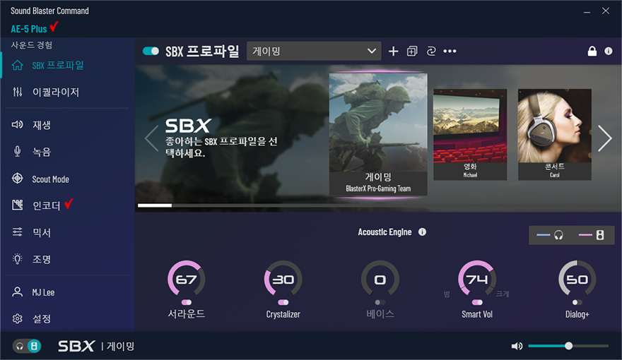 앞에서 이미 여러 번 언급을 했듯이, 이전 사운드블라스터X AE-5와 이번 AE-5 Plus 모델과의 가장 큰 차이점은 인코딩 지원입니다. 이부분은 프로그램에서도 바로 차이를 알 수 있죠. 이전 AE-5 모델을 사용하면 프로그램에 인코딩 메뉴가 없고, AE-5 Plus 모델을 사용하면 인코딩 메뉴가 있습니다. 상위 사운드카드인 사운드블라스터 AE-7, 9 모델처럼 AE-5 Plus에서부터 이제 돌비 디지털 라이브와 DTS 인코딩 효과를 볼 수 있는겁니다. 게임부터 영상/음악까지 다채널 스피커나 서라운드 헤드폰을 사용하는 사용자들에게는 훨씬 더 입체감 있는 사운드를 즐길 수 있어서 가장 반가운 기능이라 할 수 있습니다. 개인적으로도 이 기능이 가장 마음에 들었습니다.