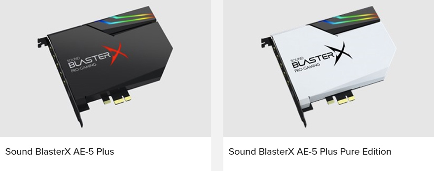 크리에이티브의 사운드블라스터X AE-5 Plus 사운드카드 외형을 살펴보면, 단순히 이전 AE-5 모델과 놓고보면 사실 큰 차이점은 없습니다. 물론, 모델명을 표기해놨던 측면 LED 네이밍부분을 통해서 구분을 해주고 있죠. 참고로, 아직 국내에는 출시가 되지 않았는데, AE-5 모델때처럼 AE-5 Plus에도 화이트 모델 'Pure 에디션'이 있습니다.