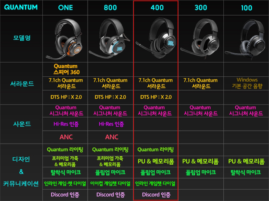 삼성 하만 JBL이 게이밍 시장 진출에 포문을 연 게이밍 헤드셋 퀀텀 시리즈 제품들 중 퀀텀 400은 퀀텀만의 특색을 보여주는 가장 기준 모델이라 할 수 있습니다. 여기서 퀀텀만의 특색이라면 퀀텀 라이팅 효과와 dts 헤드폰 2.0 지원이죠. 이 두 지원을 기준으로 퀀텀 300과 100은 하위모델로 퀀텀 800과 ONE은 정확히 상위 모델로 구분되기 때문입니다. 음향전문기업답게 사운드튜닝이 잘 되어 있어서, 모든 모델에서 체감할 수 있는 퀀텀 시그니처 사운드를 비롯해 퀀텀 서라운드와 dts 헤드폰 2.0 기능 이 2가지 모두를 즐길 수 있는 모델은 퀀텀 400부터이기 때문에 사실상 제대로된 JBL 퀀텀 게이밍 헤드셋을 체감하고 싶다면 방금 언급했듯이 가장 기준이 되는 모델입니다. 물론, 퀀텀 800과 ONE에서 Hi-Res 인증을 받고, 퀀텀 800은 최상급답게 퀀텀 스피어 360 기능까지 갖추고 있지만, 가격부담이 되는만큼 현실적인 부분에서 가장 타협하기 좋은 모델은 퀀텀 400 모델이라고 생각합니다. 물론, 여기에 돌비 디지털 스피커인 퀀텀 듀오(DUO)까지 갖춘다면 완성형 퀀텀사운드 환경을 갖추는게 되는거죠. 그럼, 이만 마치겠습니다.