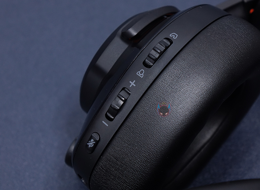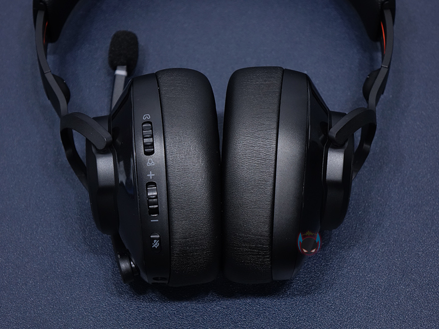 왼쪽 이어-컵에는 당연히 마이크가 적용되어 있는데, 이미 박스 표기로 확인했듯이 플립업 마이크으로 사용자에 따라 자유롭게 위치조절을 할 수 있습니다. 또한, 45도가량 위치를 지날 때 마이크 On/Off 기능이 자동으로 작동됩니다. 올릴 때와 내릴 때, 틱 소리가 나기때문에 쉽게 구분이 됩니다. 그리고, 그대로 마이크 위치 아랫부분에는 USB 케이블과 3.5mm 오디오 케이블과 연결되는 포트가 각각 배치되어 있으며, 그대로 같은 위치에서 후방향으로는 마이크 On/Off, 볼륨 조절 휠, 채팅&게임 밸런스 조절 휠이 배치되어 있습니다. 채팅&게임 밸런스는 일부 경쟁사 제품들에서도 볼 수 있는 기능으로 음성부분과 게임사운드 비중을 조절하는 기능입니다.