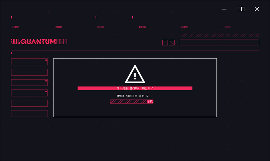 그럼, 직접 JBL 퀀텀 400 게이밍헤드셋을 사용해봐야겠죠. 기본적으로 PC와 연결을 지원하기 때문에 PC에 사용할 때는 USB 케이블로 연결하면 되고, 연결 후 인식이 되면 이어-컵 JBL로고부분에서 퀀텀 라이팅효과를 볼 수 있습니다. 이부분은 바로 뒤에서 언급할 공용 소프트웨어 퀀텀엔진을 통해서 색상 변경 및 모드 전환을 할 수 있죠. 그리고, 마이크부분도 LED 인디케이터가 적용되어 있어서 On/Off 상태를 쉽게 구분할 수 있는데, Off일때 레드LED가 점등됩니다. 그리고, PC에서 사용할 때는 공용 소프트웨어 퀀텀엔진을 설치해서 사용하면 다양한 기능들을 설정할 수 있는데, 일단 프로그램을 설치한 후에는 가장 먼저 기기 펌웨어와 프로그램 버전을 최신으로 업데이트 해주는게 좋겠죠?! 업데이트까지 마무리가 되면 튜토리얼 진행이 나오는데, 인터페이스 소개부분이라 생략해도 무방합니다.