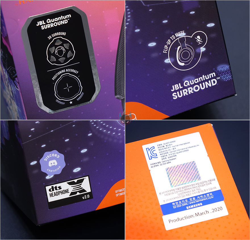 제품박스는 경쟁사들 제품들처럼 전면에 퀀텀 400 제품 이미지를 담고 있으며, 기본적으로 PC 연결을 지원하지만, 요즘 게이밍 헤드셋 제품들은 PC뿐만 아니라 콘솔 및 모바일 기기에서도 함께 지원하기 때문에 퀀텀 400도 박스부분에서 이런 지원 표기를 확인할 수 있습니다. 그리고, 제품의 주요 특징으로 퀀텀 서라운드, 플립업 마이크, 음성 채팅 프로그램 디스코드 인증, dts 헤드폰 2.0 지원을 표기해놨으며, 박스상단에는 국내 정품을 인증하는 홀로그램 스티커가 부착되어 있습니다.