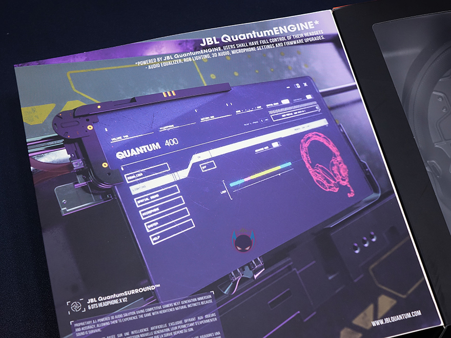 또한, 박스 전면은 도어 커버식을 적용해서 커버를 열면 내부에 포장된 퀀텀 400 게이밍헤드셋의 제품 실물을 확인할 수 있죠. 커버 안쪽에는 뒤에서 확인하겠지만, 퀀텀 엔진이라는 공용 소프트웨어 언급을 담고 있습니다. 그리고, 박스 후면에는 퀀텀서라운드, 50mm 드라이버유닛, 쿠션, 마이크, 디스코드인증에 대해서 다시 한 번 표기를 해놨으며, 전면에선 디스코드 인증만 확인했지만 후면에 디스코드 인증 외에도 SKYPE와 팀스피크 프로그램에서도 사용할 수 있다라는 지원 표기를 추가로 확인할 수 있죠. 또한, 연결 인터페이스도 3.5mm 잭 방식과 USB 방식 2가지로 지원된다라는 것도 미리 확인할 수 있습니다.