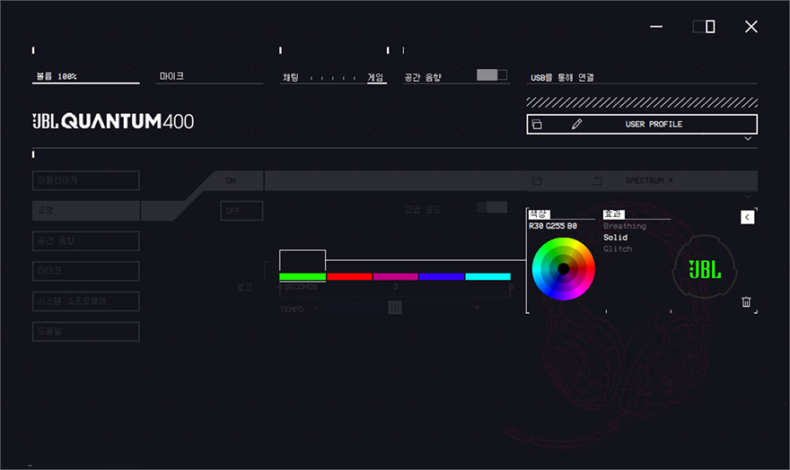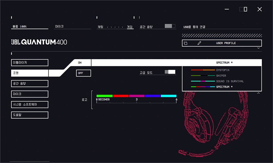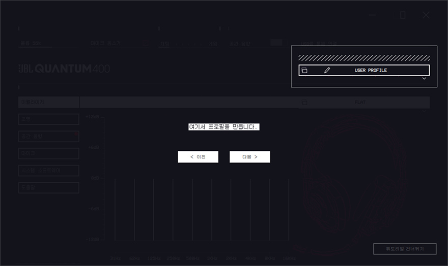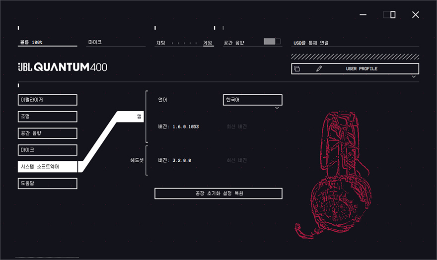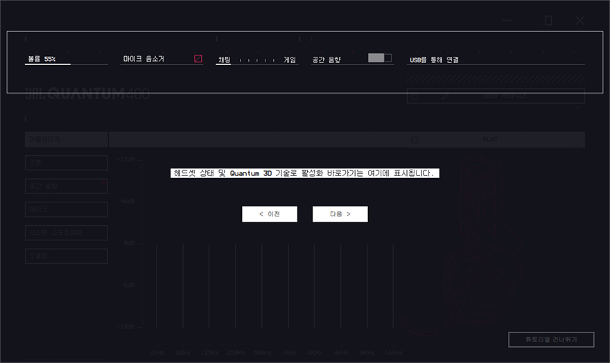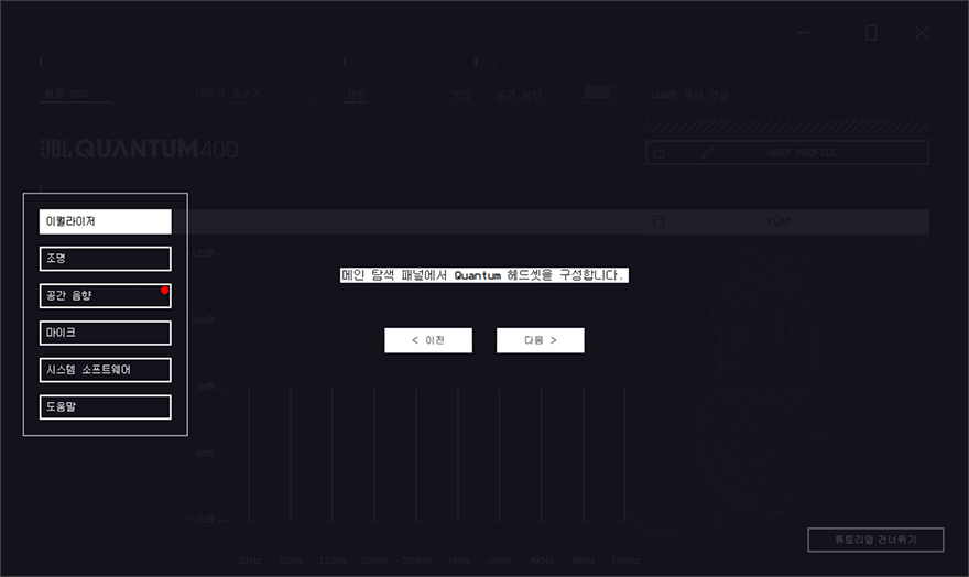 그럼, 직접 JBL 퀀텀 400 게이밍헤드셋을 사용해봐야겠죠. 기본적으로 PC와 연결을 지원하기 때문에 PC에 사용할 때는 USB 케이블로 연결하면 되고, 연결 후 인식이 되면 이어-컵 JBL로고부분에서 퀀텀 라이팅효과를 볼 수 있습니다. 이부분은 바로 뒤에서 언급할 공용 소프트웨어 퀀텀엔진을 통해서 색상 변경 및 모드 전환을 할 수 있죠. 그리고, 마이크부분도 LED 인디케이터가 적용되어 있어서 On/Off 상태를 쉽게 구분할 수 있는데, Off일때 레드LED가 점등됩니다. 그리고, PC에서 사용할 때는 공용 소프트웨어 퀀텀엔진을 설치해서 사용하면 다양한 기능들을 설정할 수 있는데, 일단 프로그램을 설치한 후에는 가장 먼저 기기 펌웨어와 프로그램 버전을 최신으로 업데이트 해주는게 좋겠죠?! 업데이트까지 마무리가 되면 튜토리얼 진행이 나오는데, 인터페이스 소개부분이라 생략해도 무방합니다.