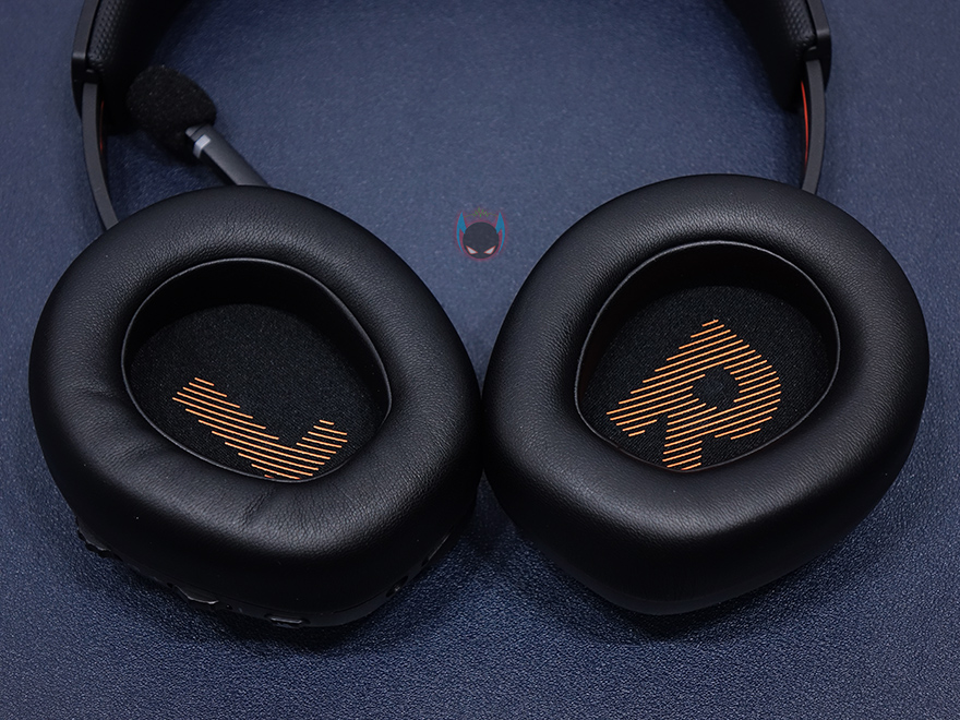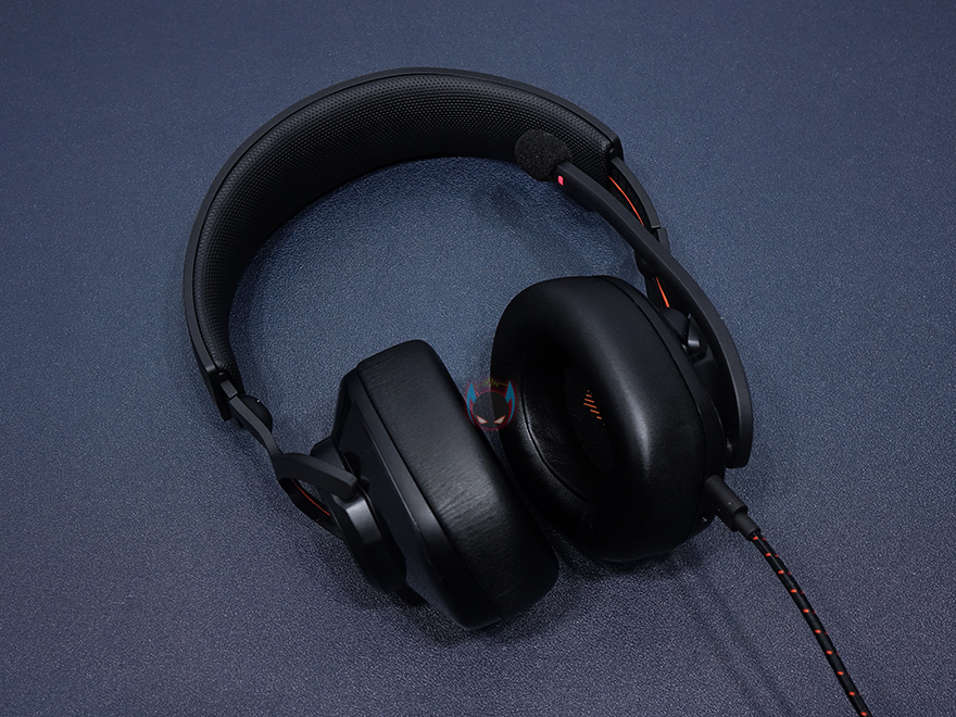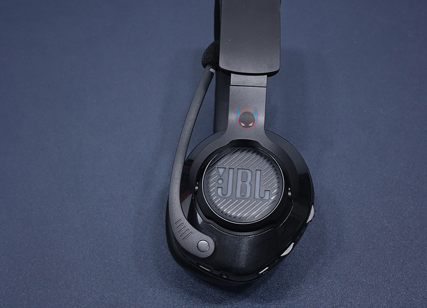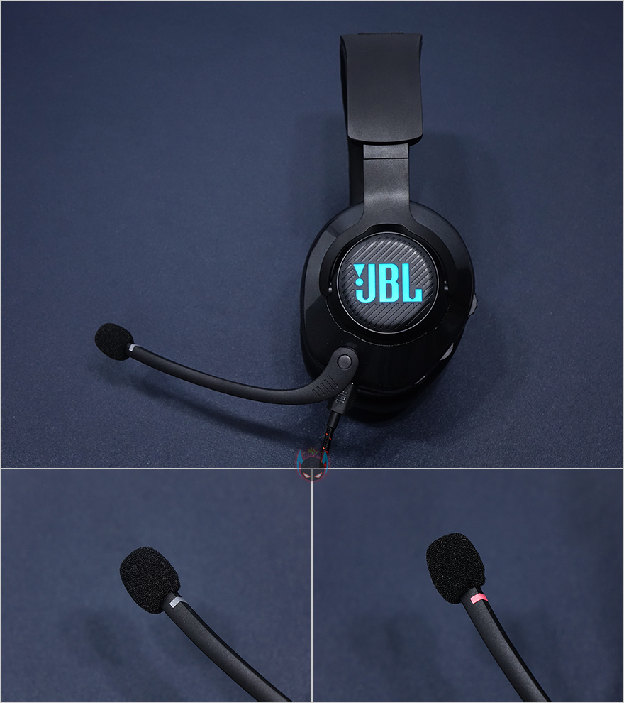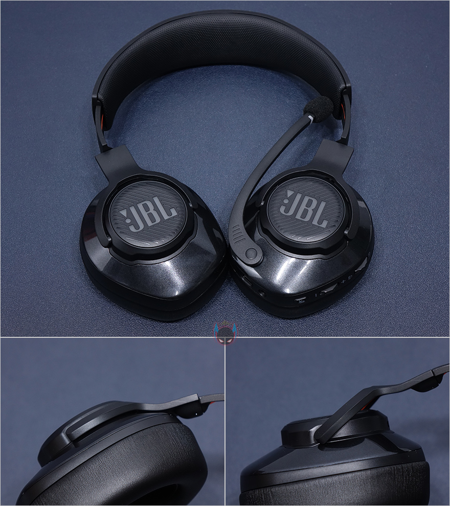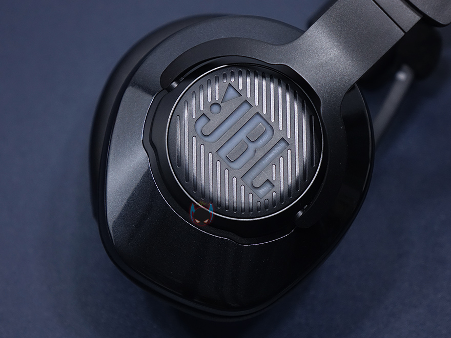 여기에 이어-컵과의 연결부위도 90도까지 회전이 가능하며, 이어-컵부분도 각도조절이 착용시 자동으로 이루어지도록 처리되어 있습니다. 이어-컵 바깥쪽부분에는 중앙에 JBL 로고처리는 해놨는데, 퀀텀 400 모델부터 LED효과인 퀀텀 라이팅 효과를 볼 수 있죠. 그리고, 주변부분들은 메탈릭 글로스인젝션으로 표면처리를 해서 고급스러운 느낌이 나도록 했습니다.