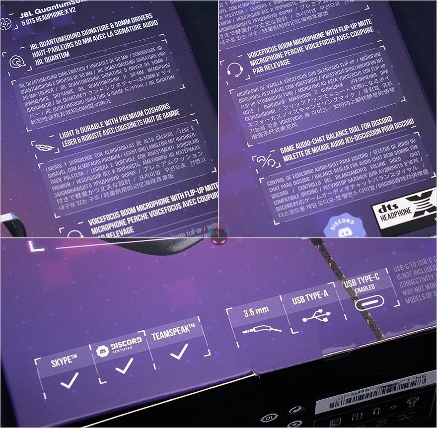 또한, 박스 전면은 도어 커버식을 적용해서 커버를 열면 내부에 포장된 퀀텀 400 게이밍헤드셋의 제품 실물을 확인할 수 있죠. 커버 안쪽에는 뒤에서 확인하겠지만, 퀀텀 엔진이라는 공용 소프트웨어 언급을 담고 있습니다. 그리고, 박스 후면에는 퀀텀서라운드, 50mm 드라이버유닛, 쿠션, 마이크, 디스코드인증에 대해서 다시 한 번 표기를 해놨으며, 전면에선 디스코드 인증만 확인했지만 후면에 디스코드 인증 외에도 SKYPE와 팀스피크 프로그램에서도 사용할 수 있다라는 지원 표기를 추가로 확인할 수 있죠. 또한, 연결 인터페이스도 3.5mm 잭 방식과 USB 방식 2가지로 지원된다라는 것도 미리 확인할 수 있습니다.