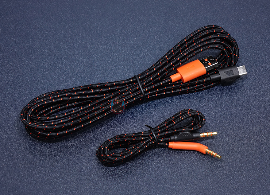 제품포장은 제품 크기에 맞춘 틀-방식으로 흔들리지 않게 밴딩처리도 되어있으며, 헤드밴드부분에 보호비닐까지 적용을 했습니다. 상당히 포장에 신경을 쓴 모습이죠. 그리고, 나머지 구성품들은 별도의 박스에 보관되어 있는데, USB 케이블, 3.5mm 오디오 케이블, 제품설명서 및 보증서를 담고 있습니다. USB 케이블은 타입C → 타입A로 연결되는 형태로 PC에 연결할 때 사용됩니다. 당연히 타입A가 PC쪽 연결부고, 3.5mm 오디오 케이블은 4극 방식으로 모바일 기기에 연결할 때 사용됩니다. 케이블 길이는 각각 3m와 1.2m이고, 꼬임방지를 위해 모두 슬리빙처리를 했습니다.