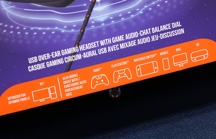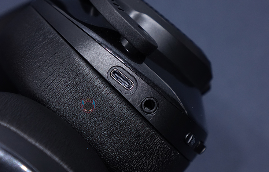 왼쪽 이어-컵에는 당연히 마이크가 적용되어 있는데, 이미 박스 표기로 확인했듯이 플립업 마이크으로 사용자에 따라 자유롭게 위치조절을 할 수 있습니다. 또한, 45도가량 위치를 지날 때 마이크 On/Off 기능이 자동으로 작동됩니다. 올릴 때와 내릴 때, 틱 소리가 나기때문에 쉽게 구분이 됩니다. 그리고, 그대로 마이크 위치 아랫부분에는 USB 케이블과 3.5mm 오디오 케이블과 연결되는 포트가 각각 배치되어 있으며, 그대로 같은 위치에서 후방향으로는 마이크 On/Off, 볼륨 조절 휠, 채팅&게임 밸런스 조절 휠이 배치되어 있습니다. 채팅&게임 밸런스는 일부 경쟁사 제품들에서도 볼 수 있는 기능으로 음성부분과 게임사운드 비중을 조절하는 기능입니다.