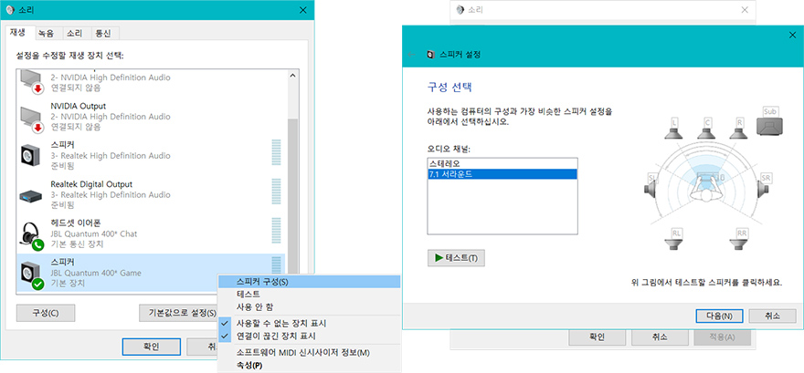 그리고, 퀀텀엔진에서 핵심기능이라 할 수 있는 공간 음향 메뉴에선 박스 표기에서 확인했듯이 dts 헤드폰 2.0과 퀀텀서라운드를 체감할 수 있습니다. 참고로, 퀀텀서라운드는 퀀텀 300모델부터 지원하고, dts 헤드폰 2.0은 퀀텀 400 모델부터 지원합니다. 일단, Off 그러니깐 기본상태로 사운드를 들어보면 기본 평면적인 사운드 느낌입니다. 여기서 dts 헤드폰 2.0으로 전환하면 다중채널 스피커를 사용했을 때 듣는 입체감 있는 사운드를 바로 체감할 수 있죠. 그리고, 여기서 좀 더 세부적으로 체감하고 싶다면 퀀텀서라운드로 전환하면 됩니다. 퀀텀서라운드는 쉽게 말해 가상 7.1채널 서라운드라고 생각하면 되는데, 정밀형/밸런스드/몰입형 3가지로 다시 나뉘어서 전환할 수 있습니다. 정밀형은 배경음같은 베이스보다는 음성적인 사운드를 좀 더 샤프하게 해주는 느낌이고, 밸런스드는 dts 헤드폰 2.0처럼 베이스와 음성 사운드를 중간으로 맞춘 형태지만 임팩트는 dts 헤드폰 2.0보다 좀 더 크죠. 몰입형은 한정된 공간에서 듣는 듯한 쉽게말해, 콘서트 및 무대실에서 듣는 사운드체감을 줍니다. 물론, 이건 이퀄라이저를 표준(Flat)으로 했을 때 기준입니다. 다시말해 이퀄라이저까지 활용하면 사용자가 원하는 사운드체감을 좀 더 정확하게 구현할 수 있다라는거죠. 개인적으로도 이 기능들이 가장 마음에 들었습니다. 그리고, 퀀텀서라운드를 즐길 때는 제어판-소리 메뉴로 들어가서 활성화된 스피커 구성에서 7.1서라운드를 선택해줘야 합니다.